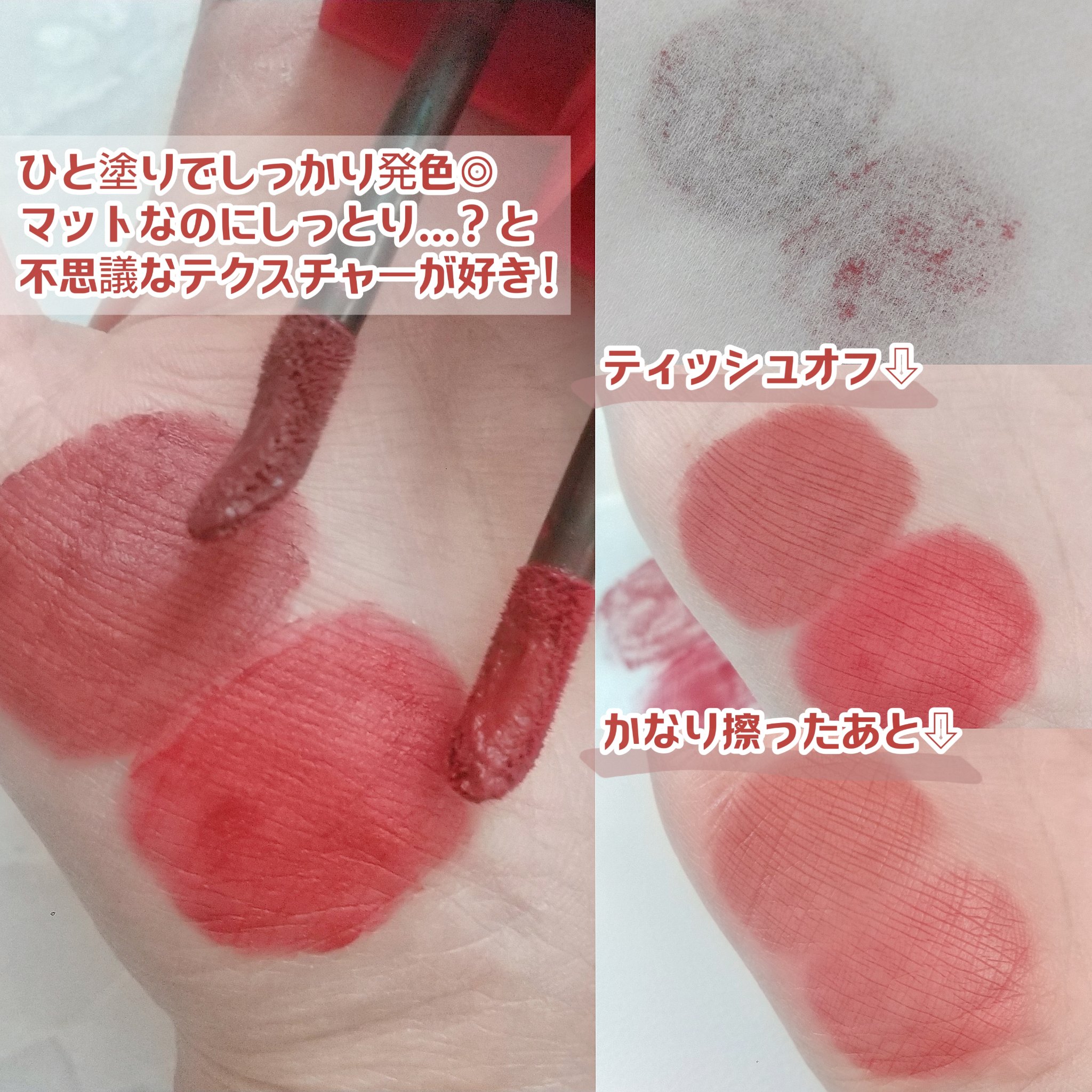 | 青みピンクで色白の方はとっても肌に馴染みやすいカラーだと思います◎ ツヤ感のある仕上がりになるリップティントで、色持ちも十分でした。 | 詳細を見る | |||