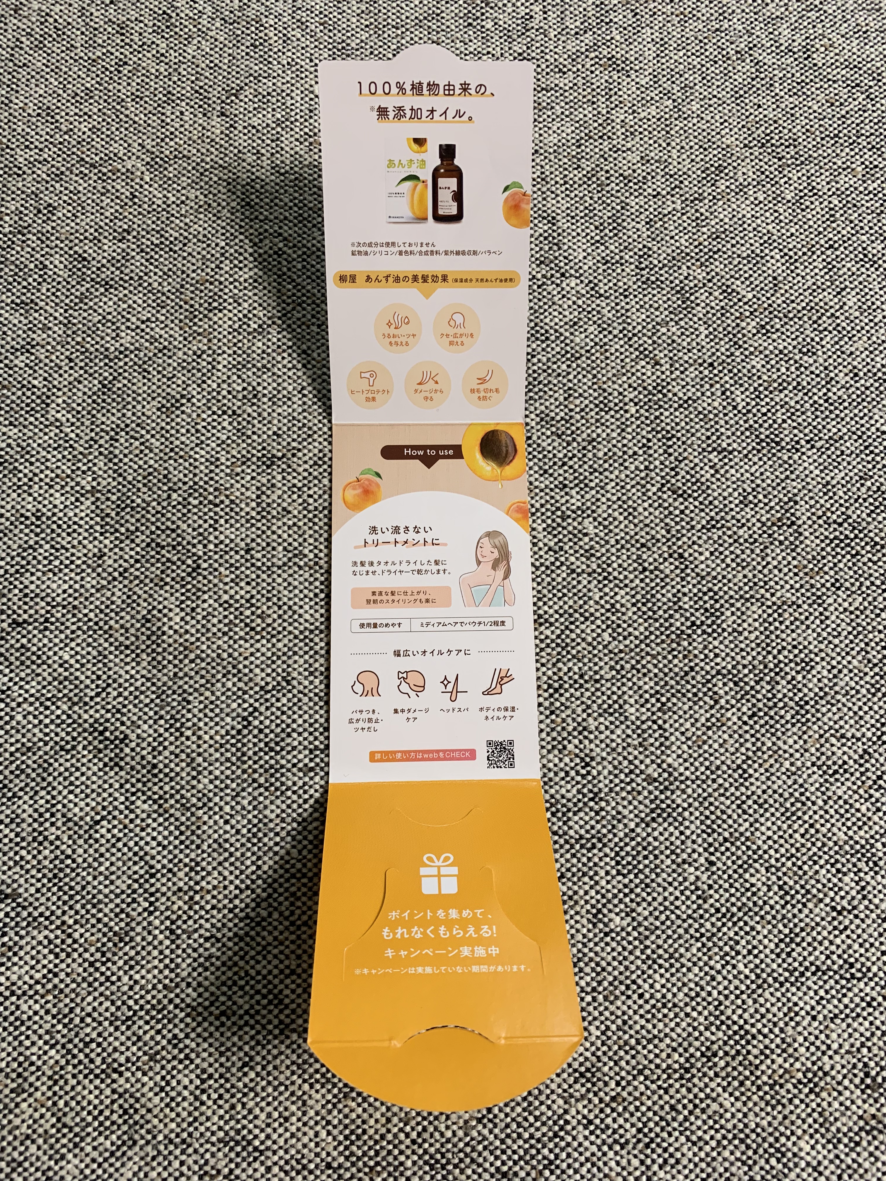 - 無添加※1にこだわった、香りまで、その全てが天然成分のヘアオイル。 あんず油は、髪への馴染みが良いのが特長です。ふわっと香りサラっとまとまる、ツヤのある美しい髪に導きます。 ヘアケアだけでなく、ボディケア・ネイルケアなど幅広い保湿ケアがこれ1本で可能です。 (※1鉱物油不使用・合成香料不使用・ノンシリコン・紫外線吸着剤不使用・着色料不使用・パラベンフリー)