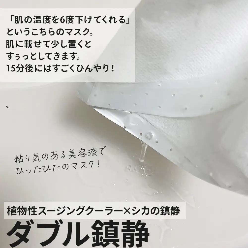 肌の温度をマイナス6度下げてくれるという、クーリング鎮静ケアができるマスクパック! 5種類のシカ成分と5種類のヒアルロン酸配合で、鎮静だけでなく水分ケアもできる! 冷蔵庫で冷やして使うのもいいそう!夏は冷やして使いたい!