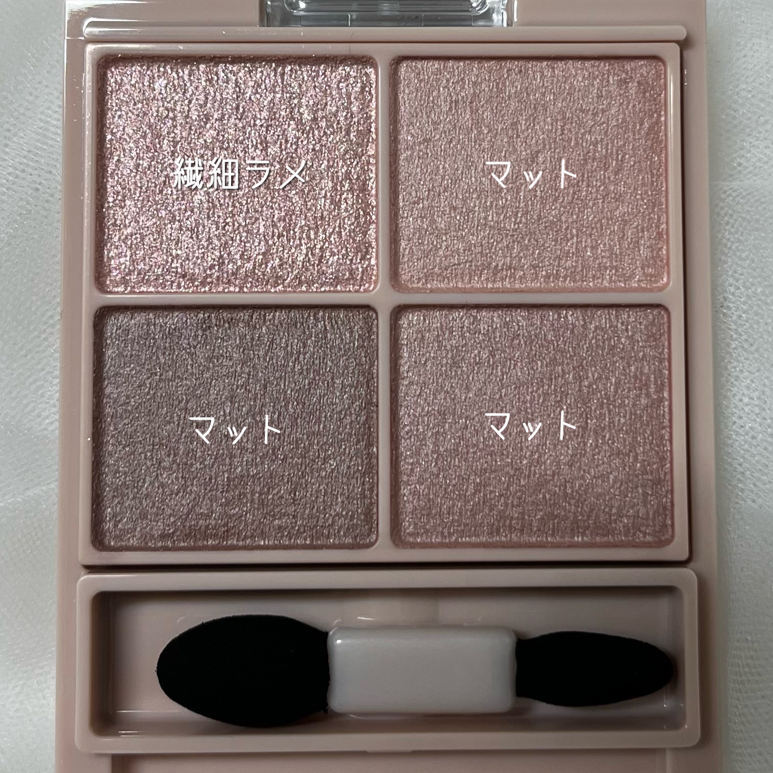 - シルキースフレアイズの姉妹品♡ 肌に溶け込むような透けマットシャドウ 透け感のある柔らかい仕上がりになるマット3色と、透け発色の繊細ラメ1色のパレットシャドウ♡ 完全マットアイや、ラメ×マットアイなど、メイクのパターンを楽しみましょう!