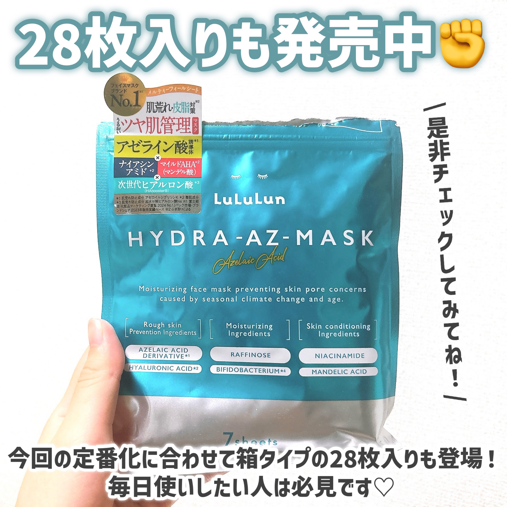 スキンケア界のマルチプレイヤー、アゼライン酸誘導体*配合の新商品🩵 今まではプラザ限定だったハイドラAZマスクが進化していよいよ全国発売するよ🤤 液自体はサラッとしたテクスチャーだけどシリーズおなじみのメルティーフィールシートでひったひたなのに液垂れしないの! 毎日使いたいから次は大容量タイプ(28枚 /2,420円(税込))をリピートしたい🫶
