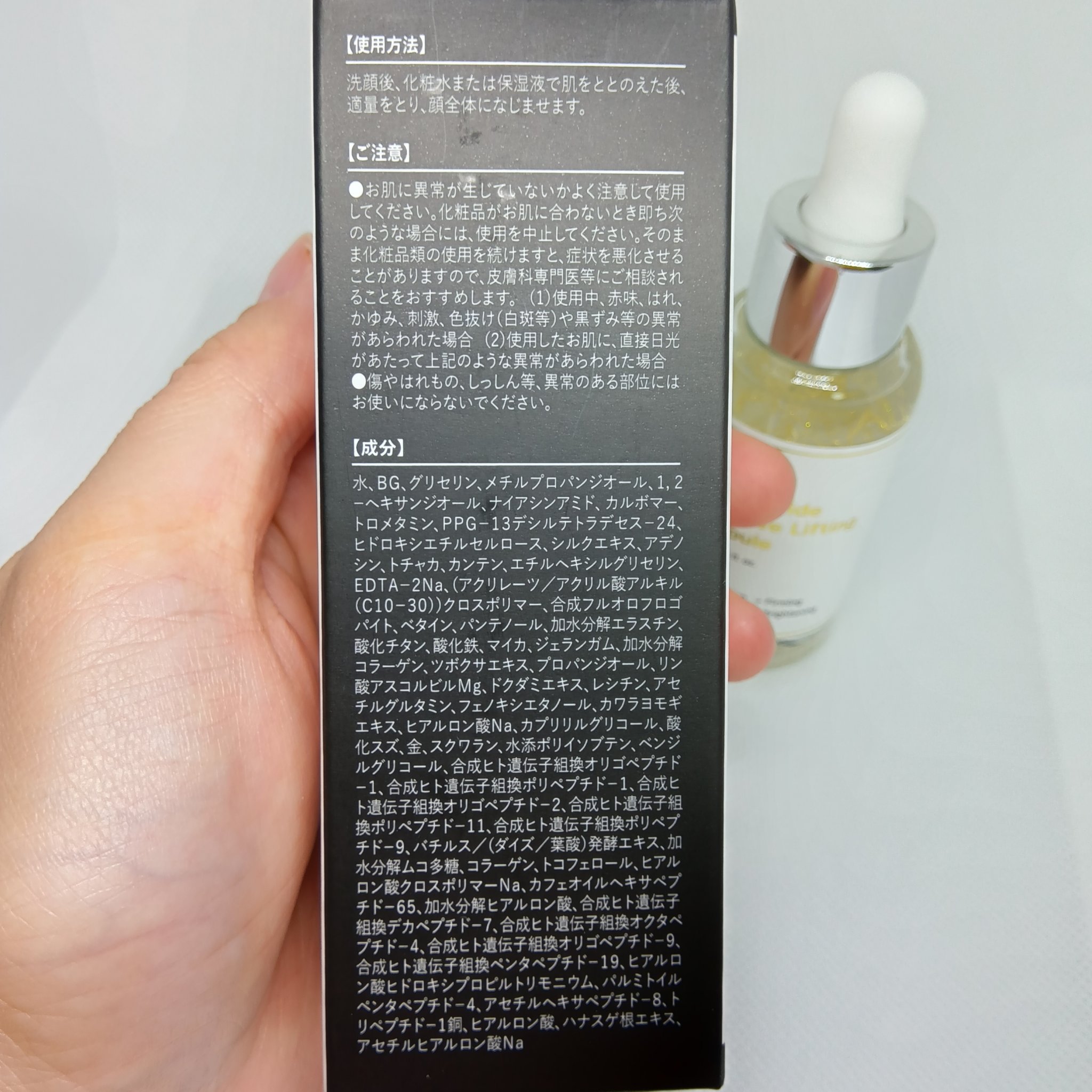 - <35mL> 水、BG、グリセリン、メチルプロパンジオール、1,2-ヘキサンジオール、ナイアシンアミド、カルボマー、トロメタン、PPG-13デシルテトラデセス-24、ヒドロキシエチルセルロース、シルクエキス、アデノシン、トチャカ、カンテン、エチルヘキシルグリセリン、EDTA-2Na、(アクリルレート/アクリル酸アルキル(C10-30))クロスポリマー、合成フルオトフロゴバイト、ベタイン、パンテノール、加水分解エラスチン、酸化チタン、赤色酸化鉄、マイカ、ジェランガム、加水分解コラーゲンエキス、ツボクサエキス、プロパンジオール、リン酸アスコルビルMg、ドクダミエキス、レシチン、アセチルグルタミン、フェノキシエタノール、カワラヨモギエキス、ヒアルロン酸Na、カプリリルグリコール、酸化スズ、金、スクワラン、水添ポリイソブテン、ベンジルグリコール、合成ヒト遺伝子組換オリゴペプチド-1、合成ヒト遺伝子組換ポリペプチド-1、合成ヒト遺伝子組換オリゴペプチド-2、合成ヒト遺伝子組換ポリペプチド-11、合成ヒト遺伝子組換オリゴペプチド-9、加水分解ムコ多糖、コラーゲン、トコフェロール、ヒアルロン酸クロスポリマーNa、加水分解ヒアルロン酸、合成ヒト遺伝子組換デカペプチド-7、合成ヒトオクタペプチド-4、合成ヒトペンタペプチド-19、ヒアルロン酸ヒドロキシプロピルトリモニウム、バルミトイルペンタペプチド-4、アセチルヘキサペプチド-8、トリペプチド-1、銅、ヒアルロン酸、ハナスゲ根エキス、アセチルヒアルロン酸Na、ラズベリーケトン