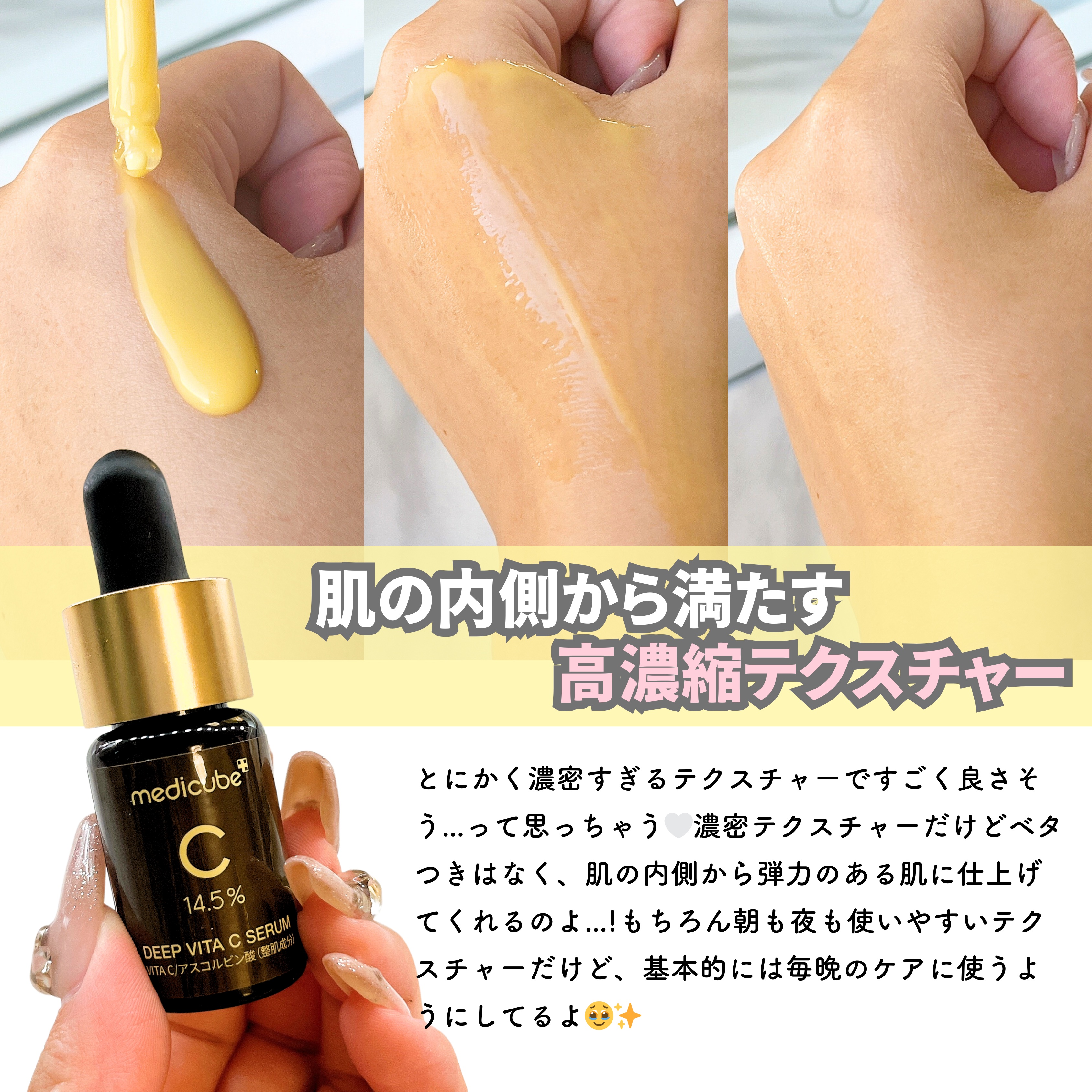 - 高濃縮のピュアビタミンC*やグルタチオン*をたっぷり配合した美容液です。 べたつかないテクスチャーで肌を保湿し、ツヤのある美肌に導きます。 ☑ピュアビタミンC* 145,000ppm配合 ☑独自整肌成分MELA-FADE ☑ナチュラルビタコンプレックス:カムカムの実エキス*・ビタミンツリーウォーター*・カカドゥプラムエキス*配合 ☑ビタミンの鮮度を維持するため、茶色の瓶3本に小分けしたパッケージを採用 ☑肌の角質層により浸透されやすい、こだわりのpH濃度(pH4.0以下)に設定 ☑乾燥によるくすみケア/弾力ケア/保湿ケア/肌キメケア 化粧水などでお肌を整えたあと、適量を取り、お肌のキメに沿ってまんべんなく塗った後、やさしくなじませます。 * 保湿成分 ■お肌に異常が生じていないかよく注意してご使用ください。化粧品がお肌に合わないとき即ち次のような場合には、使用を中止してください。そのまま使 用を続けますと、症状を悪化させることがありますので、皮膚科専門医等にご相談されることをおすすめします。また、傷やはれもの、しっしん等の異常が ある部位には、ご使用にならないでください。 (1)使用中、赤み、はれ、かゆみ、刺激、色抜け(白斑等)や黒ずみ等の異常があらわれた場合 (2)使用したお肌に、直射日光があたって上記のような異常があらわれた場合 ■目に入らないようご注意ください。目に入ったときは、こすらずにすぐに洗い流してください。その後、目に異常が残る場合は、眼科専門医へご相談され ることをおすすめします。 ■極端に高温又は低温の場所、低湿、高湿の場所、直射日光のあたる場所には保管しないでください。 ■衣類につくと、しみになることがございますのでご注意ください。 ■乳児、子供の手の届かない所に保管してください。