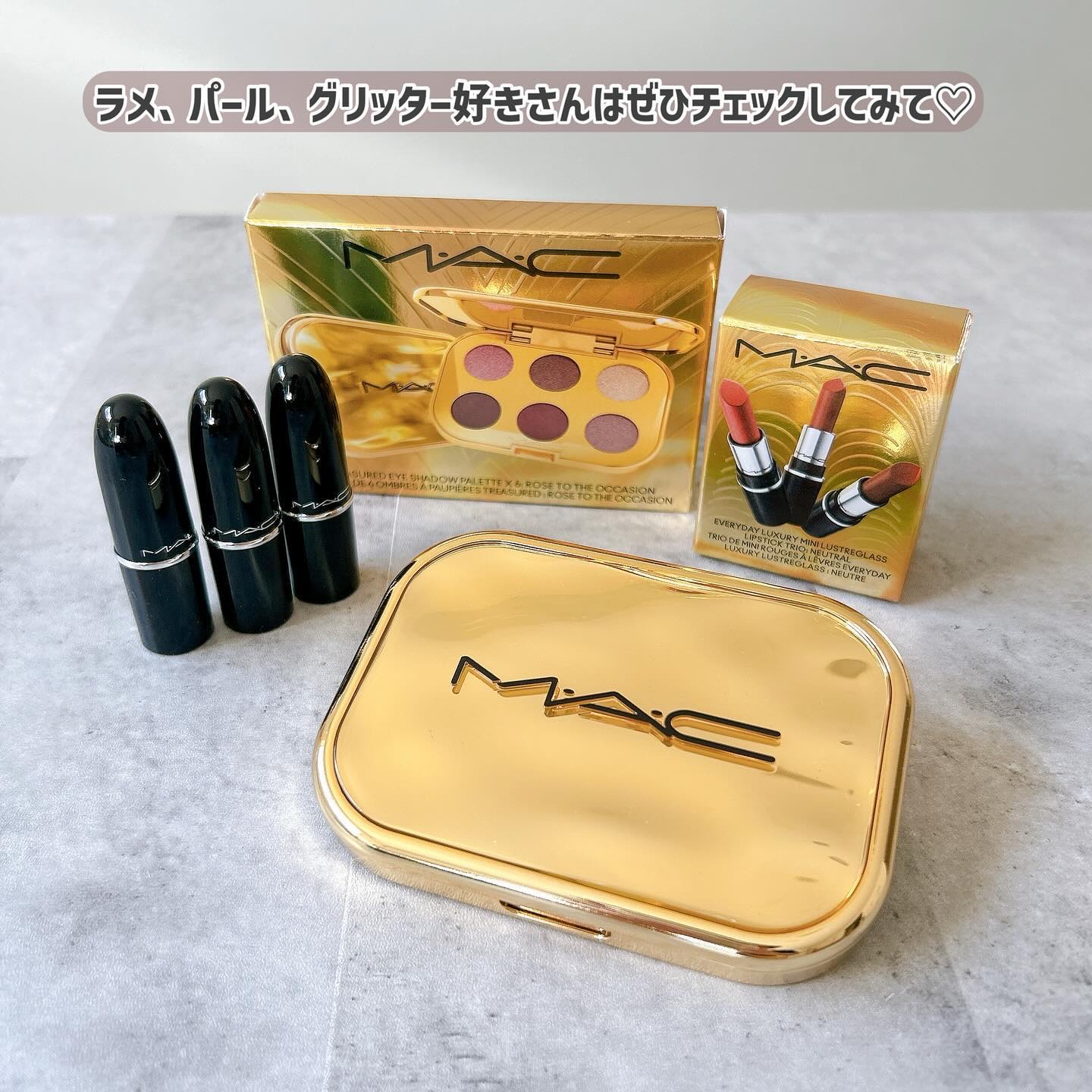 今年のM•A•Cのホリデーテーマは「GIFT OF GOLD ゴールドの魔法」 ゴールドの魔法でトレンドメイクを叶える! ホリデー限定アイテムだから、気になった人は見逃さないでね🫶✨ トレジャーアイシャドウパレット/エブリデイラグジュアリー、ミニ ラスターガラス リップスティック トリオを提供してもらったよ!