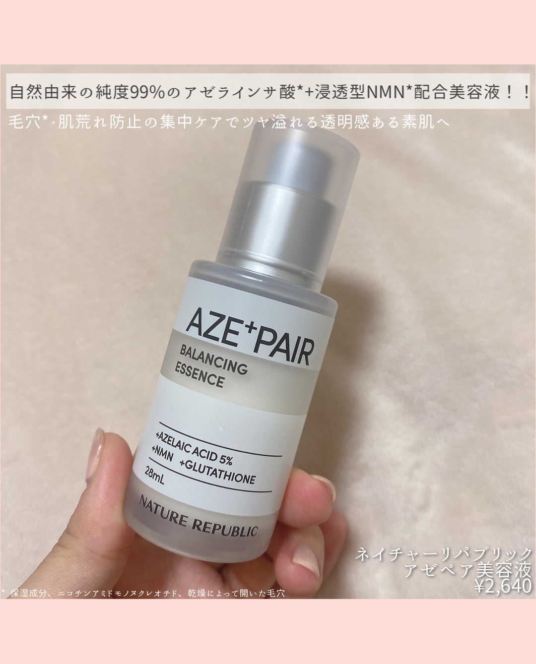 贅沢美容成分たっぷり! 話題のお化け美容液✨ ネイチャーリパブリック アゼペア美容液 使ってみました💕 ★純度99%アゼライン酸*¹+浸透型NMN配合美容液 *² ★グルタチオン*³、ナイアシンアミド*⁴、CICA*⁵ など美容成分もたっぷり配合 皮脂トラブル*⁶をケアしながらもしっかりとうるおす季節の変わり目に起こりやすいゆらぎ肌をすこやかに保つ