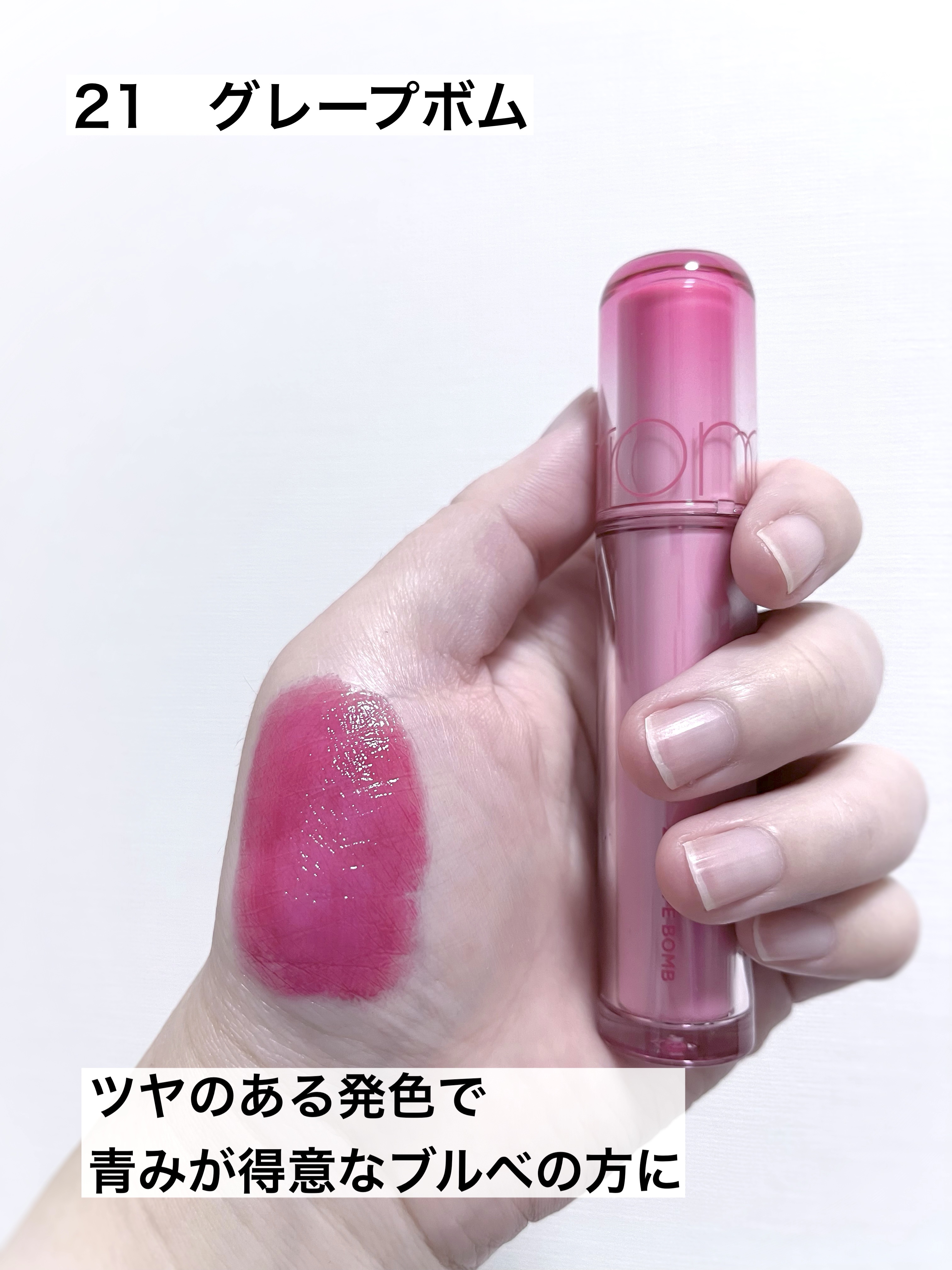【使った商品】rom&ndザジューシーラスティングティント21グレープボム【色味】青みピンク?【色もち】いい‼️飲食しても大丈夫‼️手につけて食器洗ってタオルで吹いても写真三枚目どうり‼️【保湿】使用後乾燥を全く感じない訳じゃないので保湿リッ...
