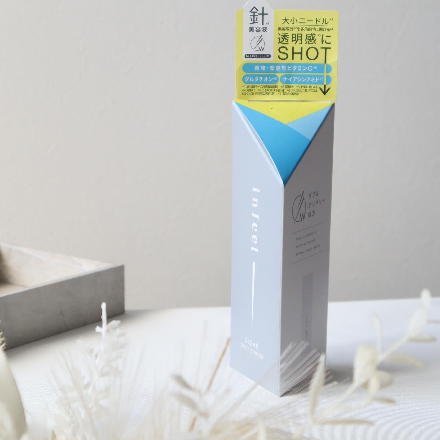 - ■「大」「小」の針*1で保水&高浸透*4を促す“ダブルデリバリー処方” 長さの異なる「大」「小」の針*1を組み合わせることで、肌への浸透*4をサポート。肌悩みに合わせた美容成分*2を多角的*3に届けながら*4、うるおいを与えます。 *1 加水分解カイメン[感触改良剤] *2 保湿成分 *3 美容液、針による *4 角層まで ■チクチク感控えめ*6を実現する“ニードル*1クッション処方” 保護膜となるクッションベールを形成して、針*1をやさしく包み込み、塗布時のチクチク感を軽減する*6独自処方を採用。マイルドな針感*6で、チクチク感の苦手な方でも使いやすいよう使用感にこだわりました。 *1 加水分解カイメン[感触改良剤] *6 針感の感じ方には個人差があります ■infeel クリアショットセラム 約600,000本(1製品あたり)の大小ニードル*1を配合した透明感*9にアプローチする針*1美容液。みずみずしく広がる美容液で、透き通るようなクリアな肌印象に。使いやすいマイルドな針感です*6。 *1 加水分解カイメン[感触改良剤] *6 針感の感じ方には個人差があります *9 うるおいによる肌印象 ●透明感*9にアプローチする美容成分×ビタミン 速攻・安定型ビタミンC*7/グルタチオン*2/ナイアシンアミド*8/アゼライン酸*2/CICA*10/浸透型*4ヒアルロン酸*11 *2 保湿成分 *4 角層まで *7 アスコルビン酸、アスコルビルグルコシド[製品の抗酸化剤] *8 製品の抗酸化剤 *9 うるおいによる肌印象 *10 ツボクサエキス[保湿成分] *11 加水分解ヒアルロン酸Na[保湿成分] ●肌表面のうるおいバランスを整えるセラミド*12ブースター *12 セラミドNP[保湿成分] パッケージデザイン 商品特長である針のモチーフをあしらったデザイン。針をイメージした三角柱の化粧箱もポイントです。 ■先行発売日:2024年10月7日(月) ※ロゼット公式オンラインショップにて先行発売 ■一般発売日:2024年10月28日(月) ※10/28はメーカー出荷日のため、店頭での展開開始日は店舗の状況により異なります。 ■流通:全国のバラエティショップ(※一部店舗を除く)ロゼットの各公式オンラインショップにて発売予定 【ロゼットオンラインショップ】https://rosette.jp/