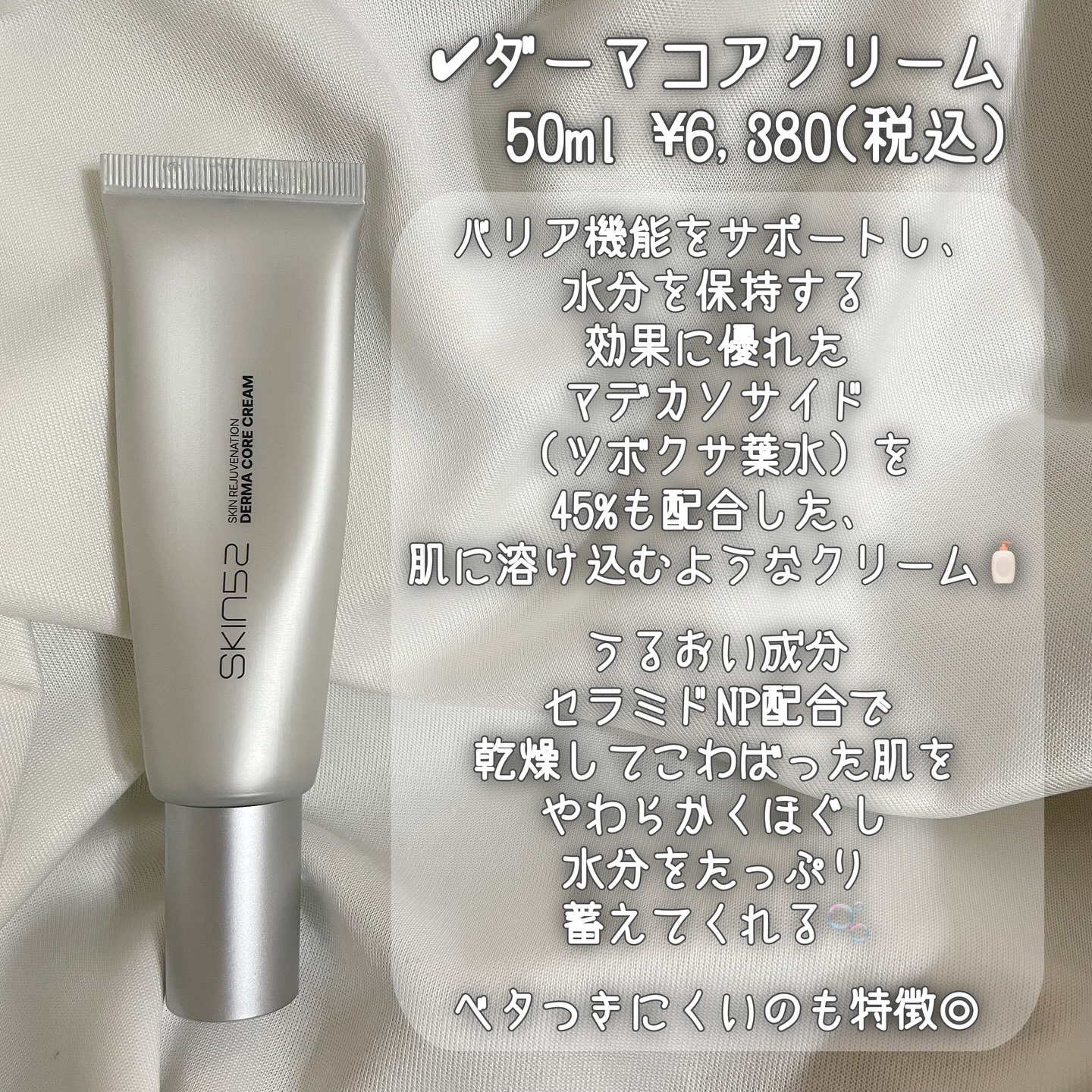 薬用クリームだからなんとなく安心して使えて めちゃくちゃ高保湿で 乾燥肌の私にはピッタリだった🥹🤍 「天然型ビタミンE」が配合されてるんだけど これは肌の血行を促進し、肌に必要な栄養素を補給しながら ターンオーバーを整えてくれるんだって🫣 そして、私の大好きな成分のひとつの 「グリチルリチン酸ニカリウム」で肌あれを抑えてくれる◎ 最初はボディの乾燥が気になる部分にだけ使ってたけど サイトを確認したらお顔の使用も推奨されてて 顔の頬や鼻のあたりは血行が行きわたりにくい部位だから そこに塗るといいみたい👀🤍 もうかなり寒くなって保湿アイテム欠かせないから プチプラで良さそうなやつ探しまくってる🥹