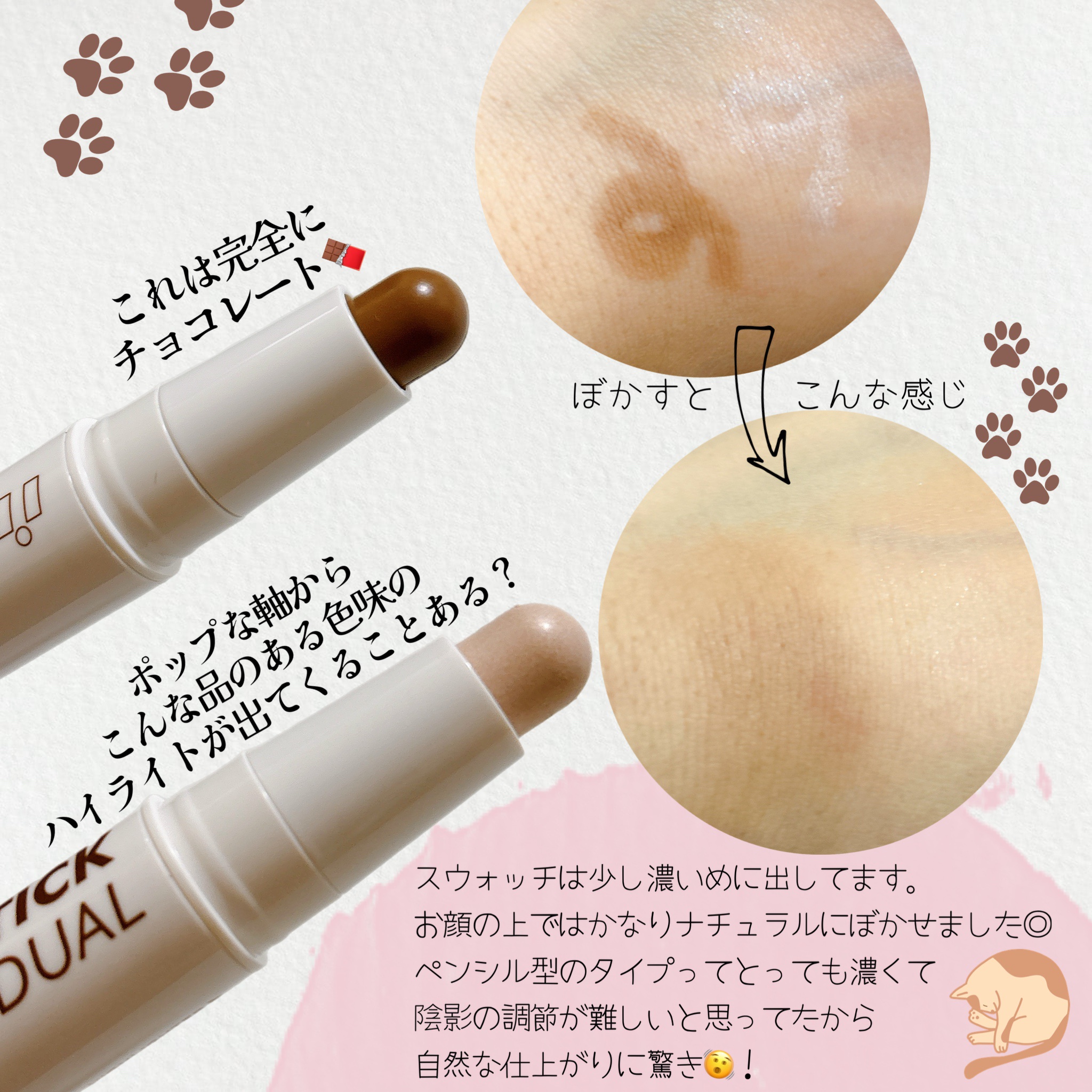 - 狭く、小さく、ピンポイントに! 絶妙1.1cm幅のスティックタイプで欲しい陰影を狙い撃ち。 肌なじみがよく暗すぎないシェーディング&光すぎないハイライトが1本に。