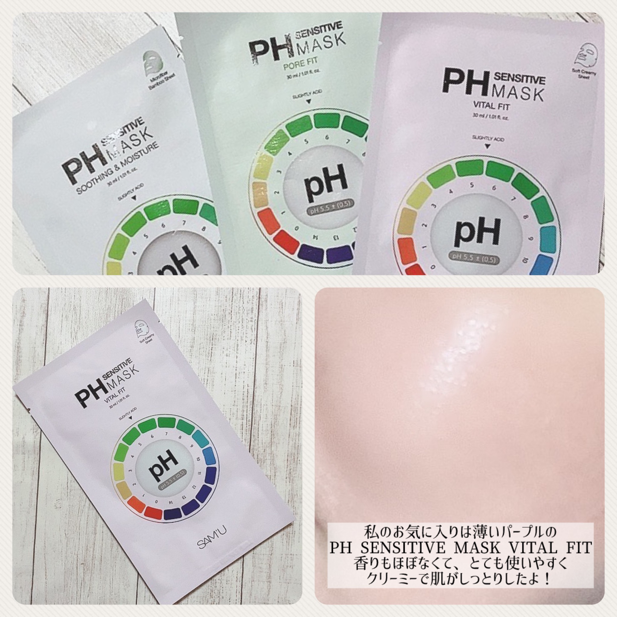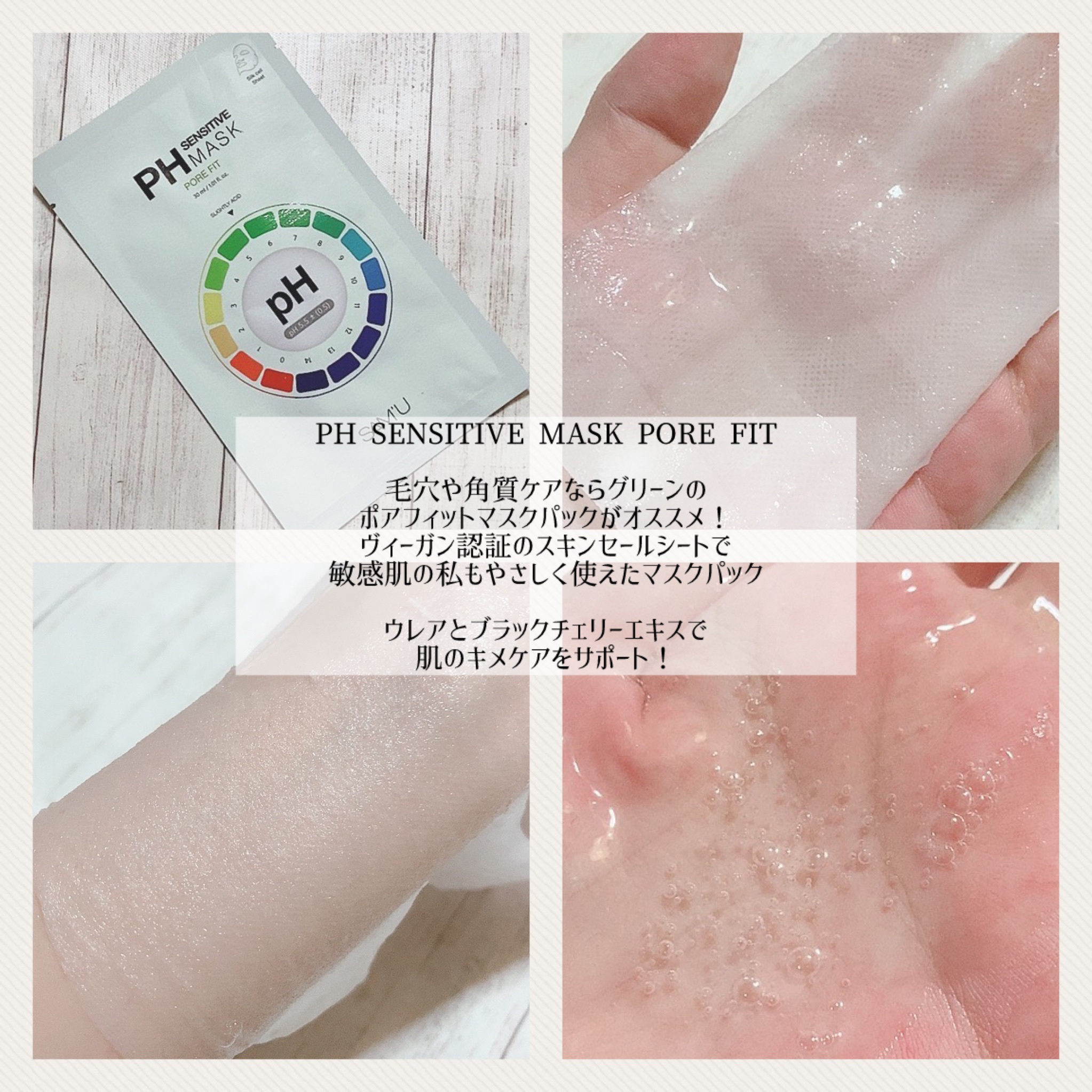 PH SENSITIVE MASK VITAL FIT 張り感やしわが悩みの方向き🫶 コラーゲンと抗老化成分であるNMNなど入っていてしわ改善機能性マスクパックです。 PH SENSITIVE MASK AQUA FIT 1枚で保湿、鎮静、肌のバリアまでオールインワンケアが可能なマルチマスク✨ 760万枚突破、湯葉のようなひたひたマスクで、つけた瞬間から最後まで乾かずしっとり感キープしてくれます。 PH SENSITIVE MASK PORE FIT 毛穴や角質が悩みの方向き!ヴィーガン認証スキンセールシートで敏感肌もやさしく使用できるマスクパック