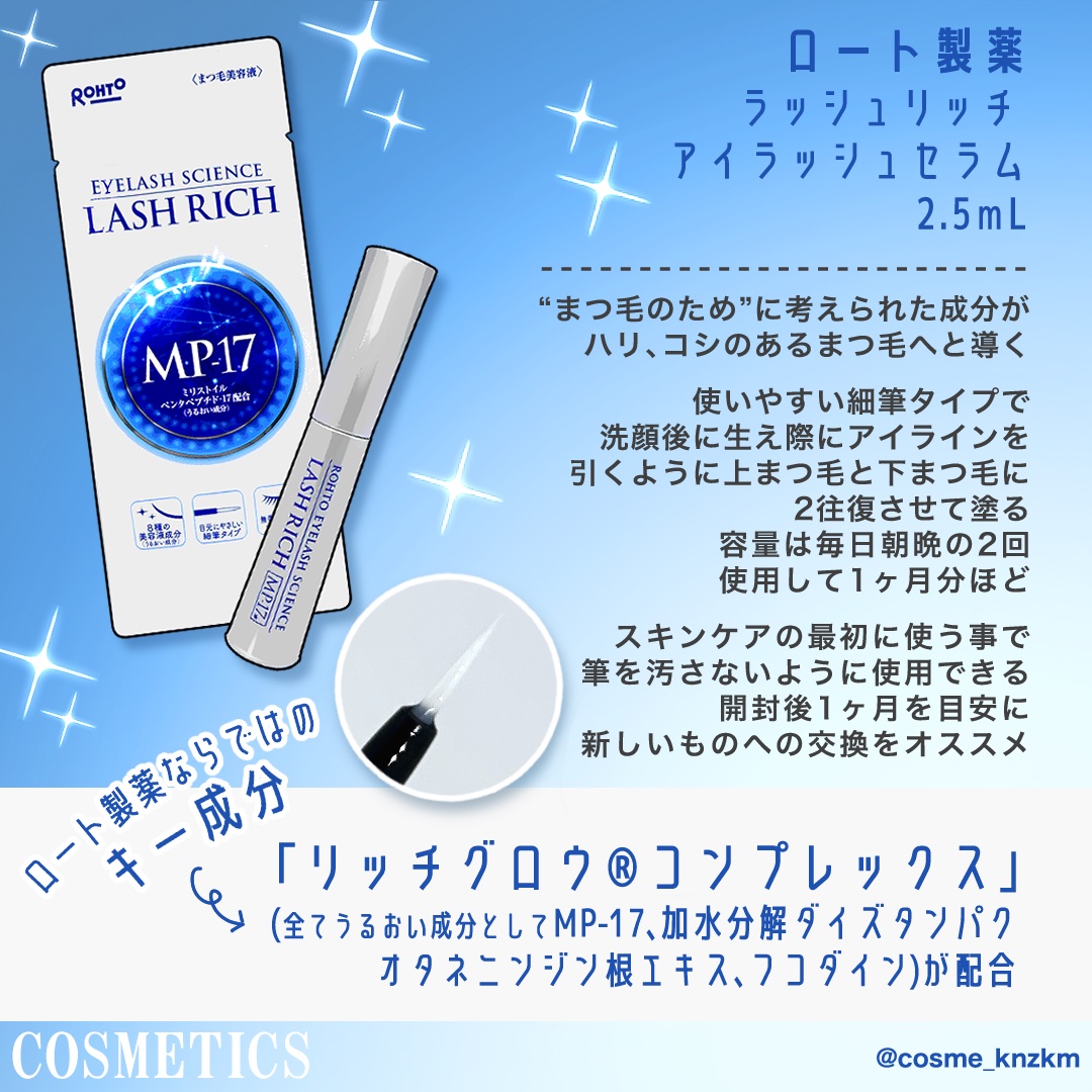 ロート製薬、独自成分配合のまつ毛美容液‼️独自成分プラス6種の美容液成分*も配合💖*うるおい成分☑️ラッシュリッチアイラッシュセラム2.5ml1日に朝・晩2回塗ってまつ毛にハリとコシケア✨1ヶ月で1本使い切りが使用目安極細筆だからまつ毛の際に...