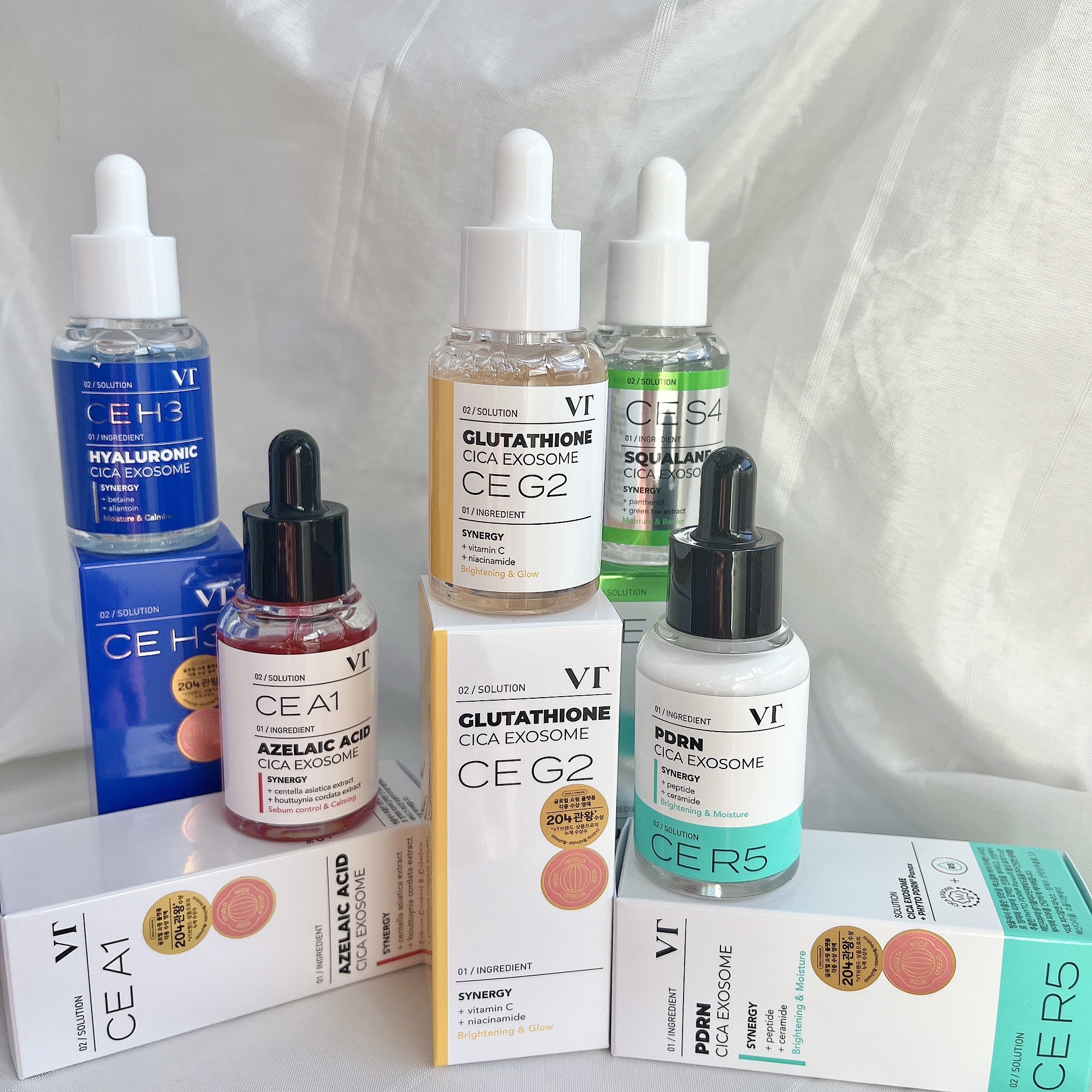 CICAエクソソームアンプル A1カーミング…透明な赤い色合いのアンプル。小鼻脇まで塗りやすいのでメイク前の皮脂防止にも。 CICAエクソソームアンプル G2ブライトニング…ほんのりとろみを感じ、肌へ馴染むとサラっと。配合成分から私は朝に使用。 CICAエクソソームアンプル R5ファーミング…5つの中でとろみを感じる乳液みたいな真っ白なアンプル。個人的にPDRNが気になっていたので夜はこちらを使用中です。