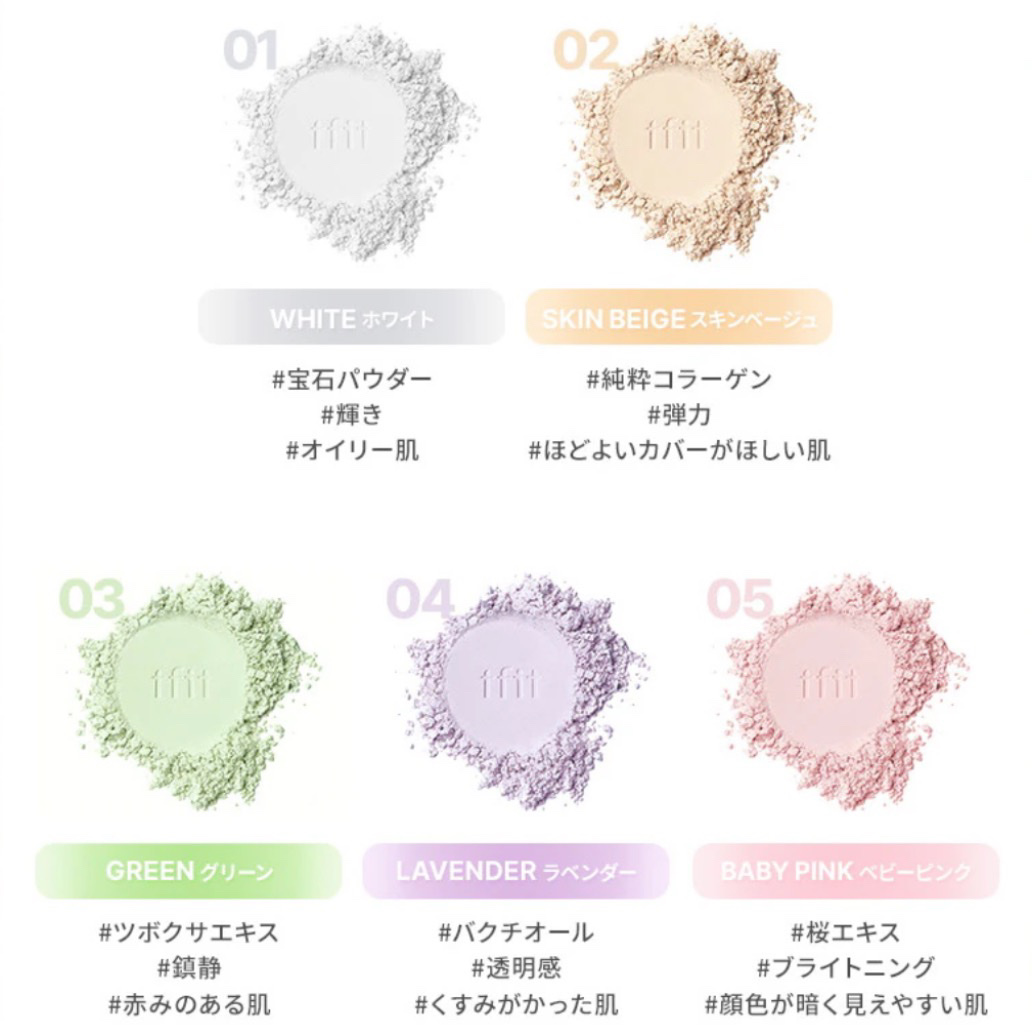 - <01 ホワイト(White)> シリカ、オクテニルコハク酸デンプンAl、(ジメチコン/ビニルジメチコン)クロスポリマー、合成フルオロフロゴパイト、トリ(カプリル酸/カプリン酸)グリセリル、ヘキサ(ヒドロキシステアリン酸/ステアリン酸/ロジン酸)ジペンタエリスリチル、水、BG、モモ花エキス、加水分解コラーゲン、加水分解エラスチン、アラントイン、グリシン、セリン、アラニン、アスパラギン酸、リシン、グルタミン酸、アルギニン、ロイシン、プロリン、チロシン、フェニルアラニン、バリン、イソロイシン、トレオニン、ヒスチジン、システイン、メチオニン、1,2-ヘキサンジオール、ジメチコン、カプリル酸グリセリル、アメジスト末、ダイヤモンド末、パール、サファイア末、PCA-Na、ベタイン、ソルビトール、トコフェロール、香料 <02 スキンベージュ(Skin Beige)> シリカ、オクテニルコハク酸デンプンAl、(ジメチコン/ビニルジメチコン)クロスポリマー、合成フルオロフロゴパイト、トリ(カプリル酸/カプリン酸)グリセリル、ヘキサ(ヒドロキシステアリン酸/ステアリン酸/ロジン酸)ジペンタエリスリチル、水、BG、モモ花エキス、加水分解コラーゲン、加水分解エラスチン、アラントイン、グリシン、セリン、アラニン、アスパラギン酸、リシン、グルタミン酸、アルギニン、ロイシン、プロリン、チロシン、フェニルアラニン、バリン、イソロイシン、トレオニン、ヒスチジン、システイン、メチオニン、1,2-ヘキサンジオール、ジメチコン、カプリル酸グリセリル、トリエトキシカプリリルシラン、アメジスト末、ダイヤモンド末、パール、サファイア末、ベタイン、PCA-Na、ソルビトール、トコフェロール、酸化鉄、香料