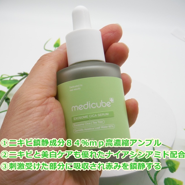 肌を健やかに保つ成分が高濃縮されているという所です!更にニキビの跡もケアしてくれるナイアシンアミドも配合。 毛穴より510倍小さいサイズで、通常のシカより5.3倍ニキビの出来やすい肌をケアしてくれて、水分補給もしてくれるそう。 濃厚なセラムですが、少量で大変延びが良くあまりベタつきません。塗った後は肌温度が下がったように感じられたあたり、水分補給と肌を健やかに保ってくれる効果はばっちりかと思います。