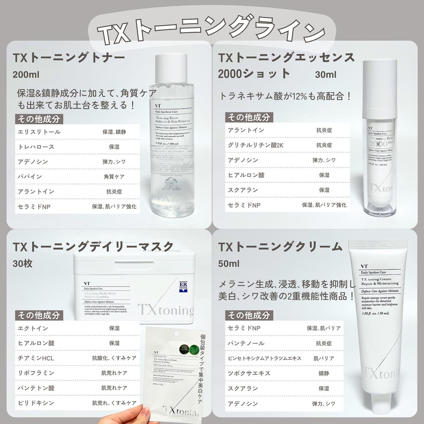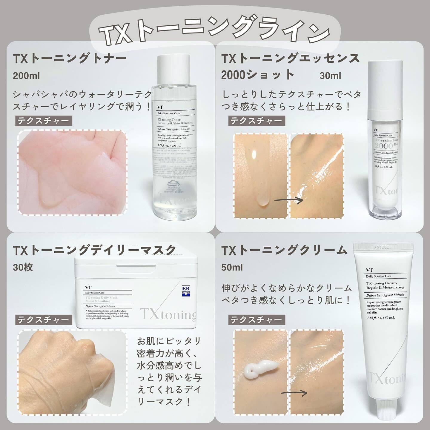 VT史上初、メガ割最大お得セット出るよ! TXトーニングライン4選とリードルショットや新商品のグルカミューンエッセンスとのセットなど肌悩みに合わせて選べるエッセンスでのセット販売など、Qoo10メガ割でお得にゲットできるのでおすすめ💖 TXトーニングラインは乾燥くすみや、トラブルの蓄積にアプローチし、艶やかなすっぴん美肌に導く、塗るレーザートーニングシリーズ✨ このシリーズを2週間ほどしっかり使ったんですが、ほんとに肌が変わる感覚があって、めっちゃ肌の調子がいい😳 リピ確定でライン使いしたいスキンケアになりました!