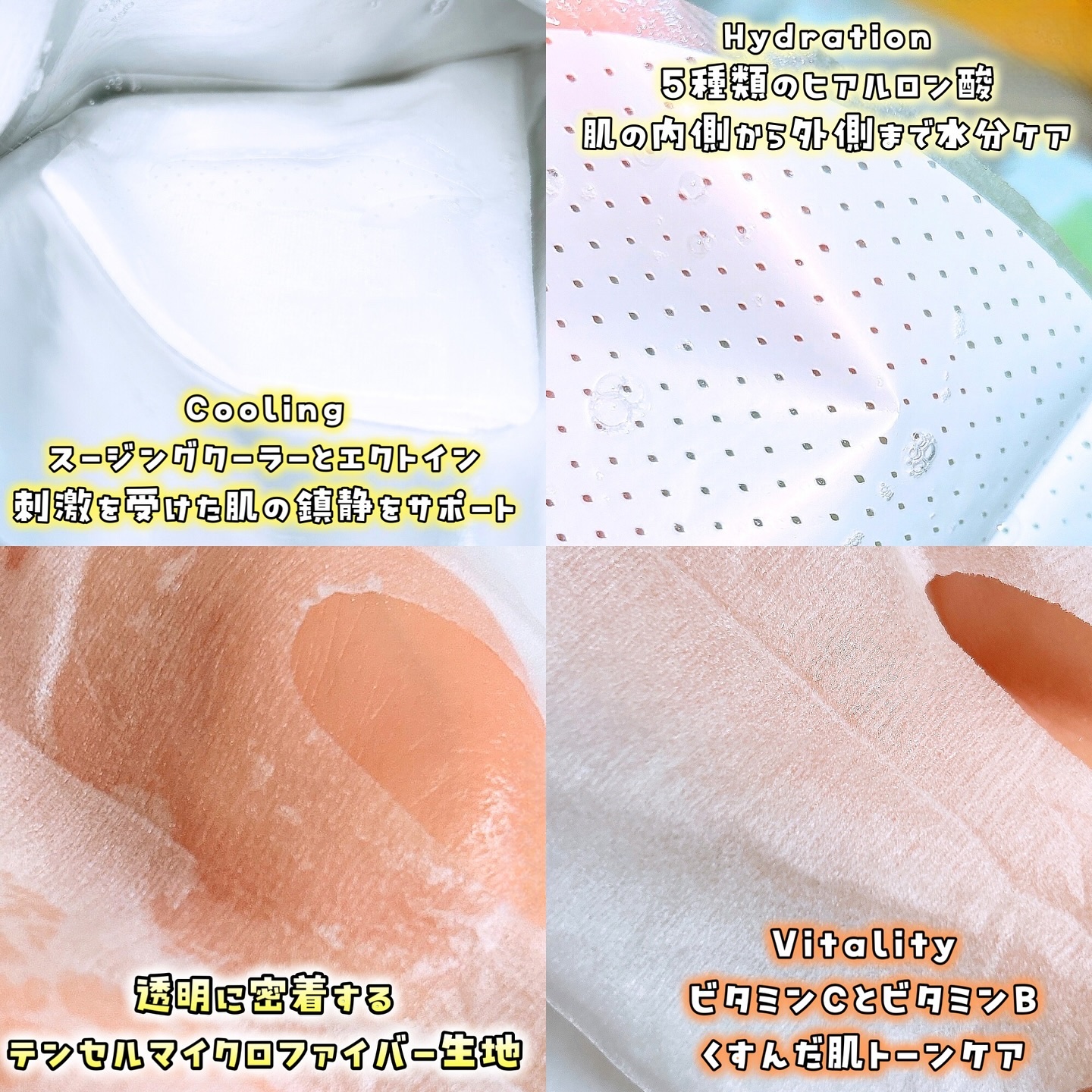ビタミンラインのフェイスマスクは美容成分グルタチオン、ナイアシンアミド(ビタミンB3)、ビタミンCを配合し、肌くすみをケアしながら肌を活性化させ乾燥を感じにくい明るい素肌を叶えるデイリーマスク みずみずしいエッセンスがマスクにたっぷり含まれているので、余ったエッセンスをデコルテに使用するのが私のお気に入り 刺激や痒みなどの肌負担がなく思う存分保湿されて、乾燥が落ち着くので満足度が高いマスクだと思います