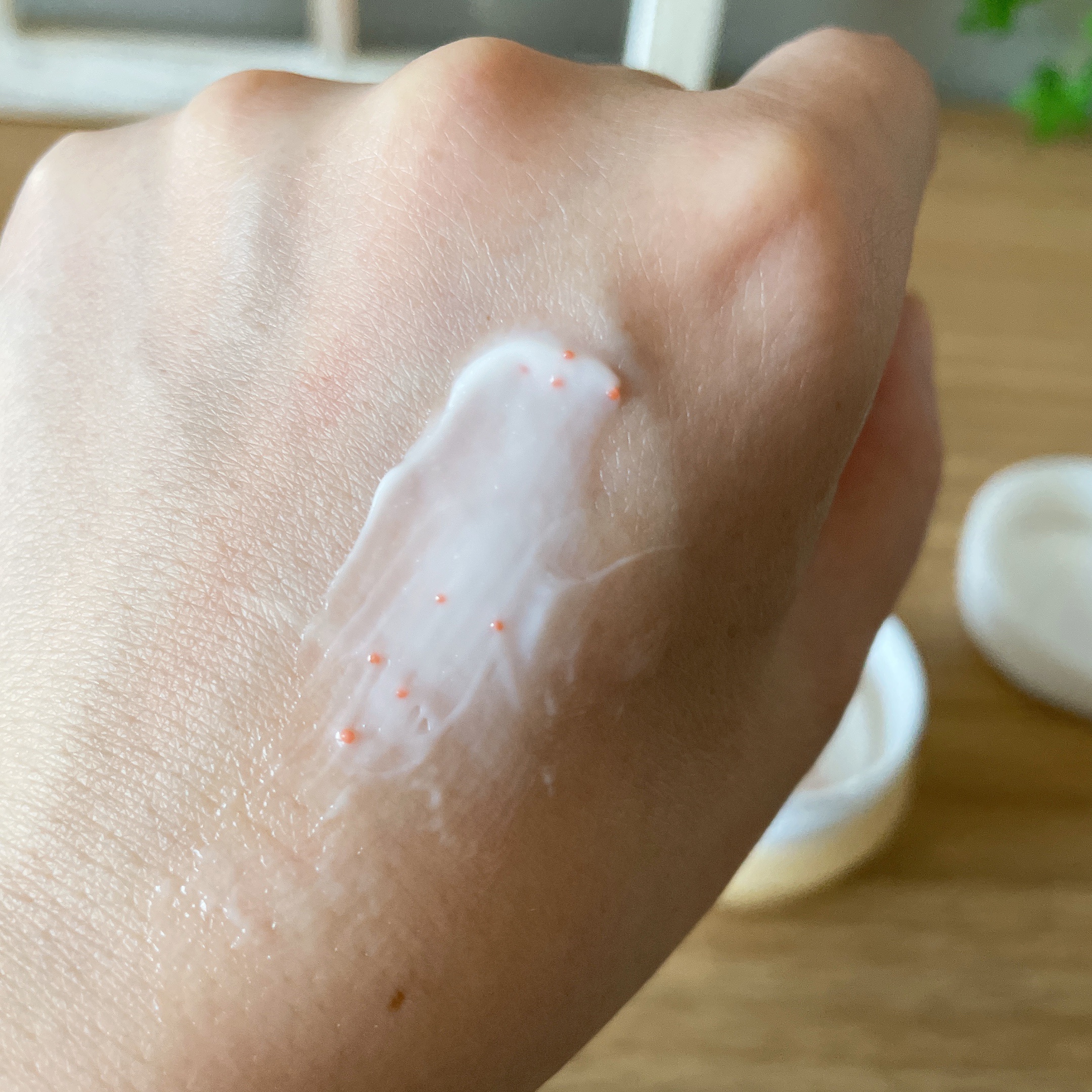 救世主の高保湿クリーム🤗 乳白色の柔らかめクリーム オレンジのプチプチが入ってて、これがビタミンオイルカプセル※2 オイルが体温でトロっと溶けてオレンジ色のカプセルが自然に一体化🤲