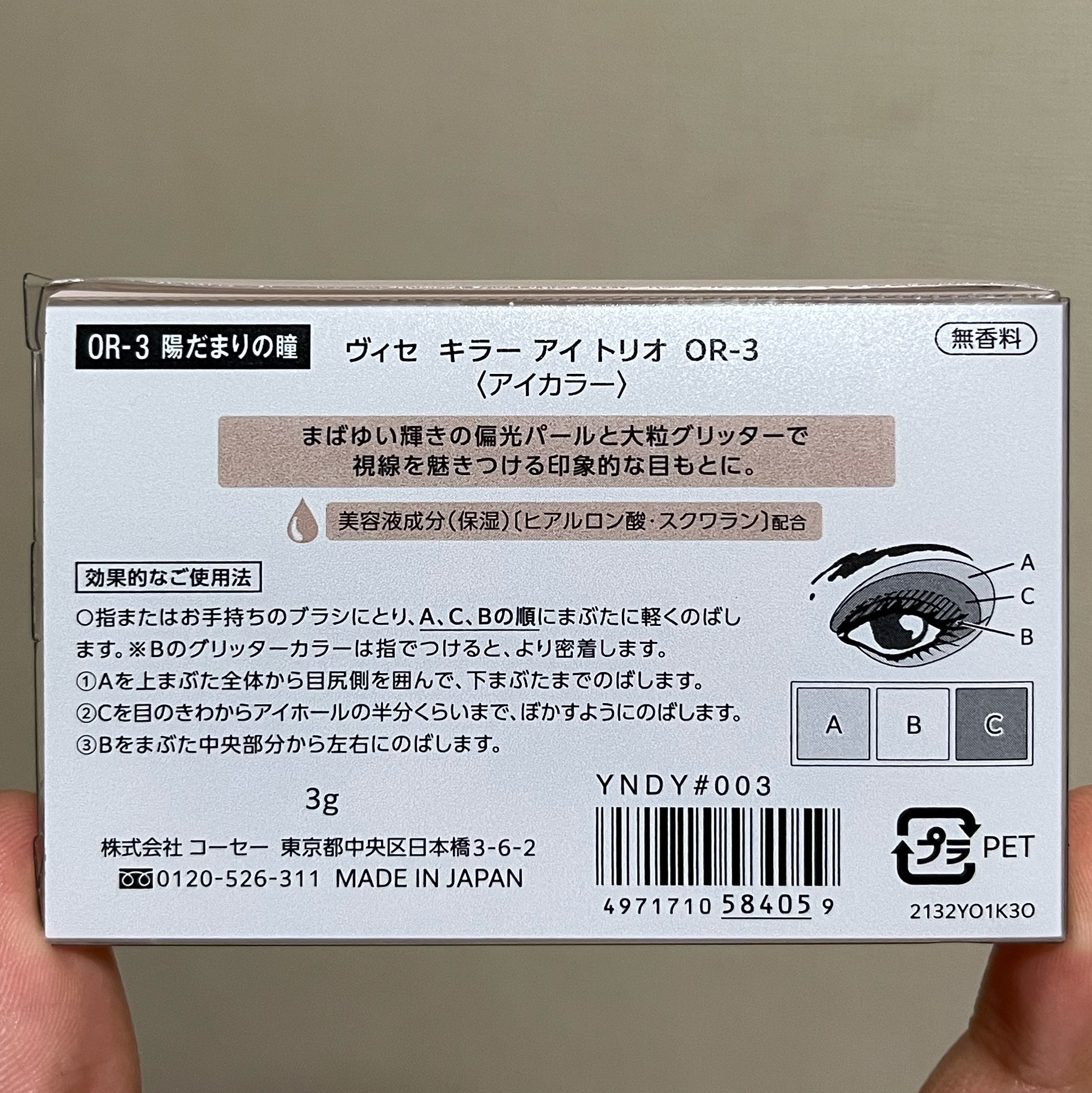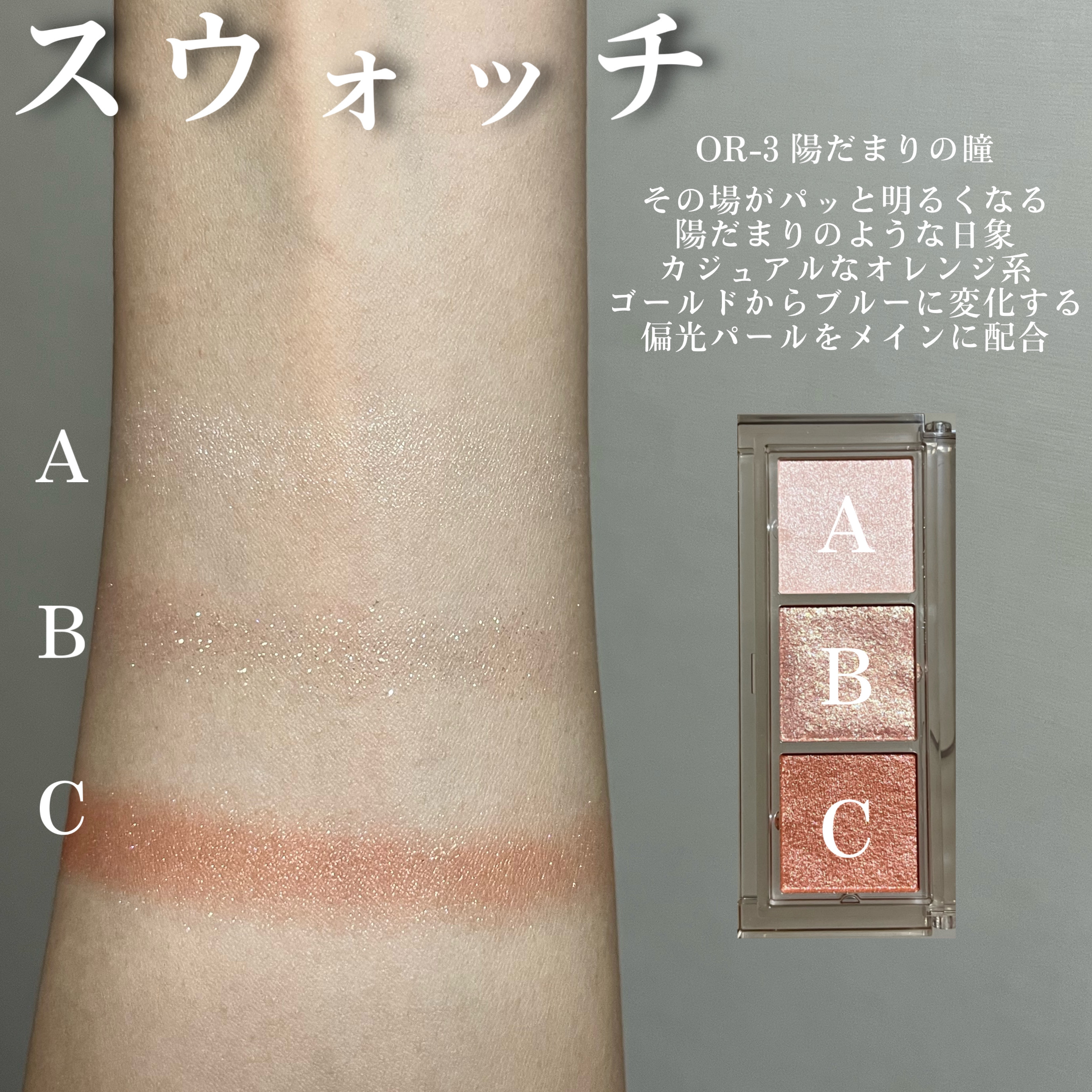 - 角度によって色が変わる高輝度偏光パールを多量配合。動くたび輝きが変化する高密着な3色入りセットアイカラー。 ● 高輝度偏光パールと大粒グリッターを贅沢に配合した、3 色セットのアイカラーです。 まぶたにしっとりとけこむようにフィットして、大粒パールやグリッターも高密着。 大胆に輝き、色気を放つ目もとがつづきます。 ● 見る角度や光の当たり具合により色味が変化する高輝度偏光パール(カラーチェンジグリッター)とクリアで高輝度な大粒グリッターを組み合わせて配合。 まばたきや動きにより色と輝きが変化する、魅力的な目もとを演出します。 ● 化粧もちを高めるフィットオイル成分配合。まぶたにピタッと密着し、パール落ちを防止。 高い透明感とツヤ感も付与し、美しい仕上がりが持続します。 ● カラーによって異なるベースを採用。 [ハイライトカラー(A)] もちっと生質感で、肌にとけこむように密着するスフレベース。 繊細なパールの輝きで、まぶたに光を取りこみ、下地効果でアイカラーの密着も高めます。 [グリッターカラー(B)] 輝きを最大限に引き出す透明性の高いベースに、高輝度偏光パールと大粒グリッターを贅沢に配合。 密着性の高いフィットオイル成分とペーストオイルをかけあわせることで、パール落ちも防止。 [アクセントカラー(C)] のび広がりのよさと高い密着性を両立して美発色を叶えたベース。 フィットオイル成分を最高量配合(パレット内比)し、粉体をコーティングすることで クリアで美しい発色と上質なツヤが持続します。 ● 無香料