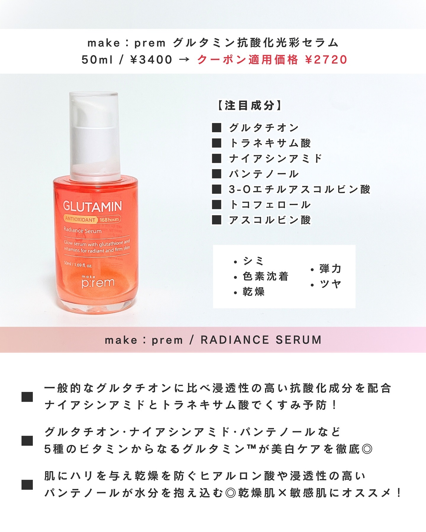 𝒎𝒂𝒌𝒆𝒑:𝒓𝒆𝒎@makeprem_jp・グルタミン抗酸化光彩セラム・エンドポアベジチノールセラム/ この2つ人気だけどどうちがうの!?気になるセラム比較!\ ⬜︎グルタミン抗酸化光彩セラムナイアシンアミドやトラネキサム酸配合!今流行りのグ...