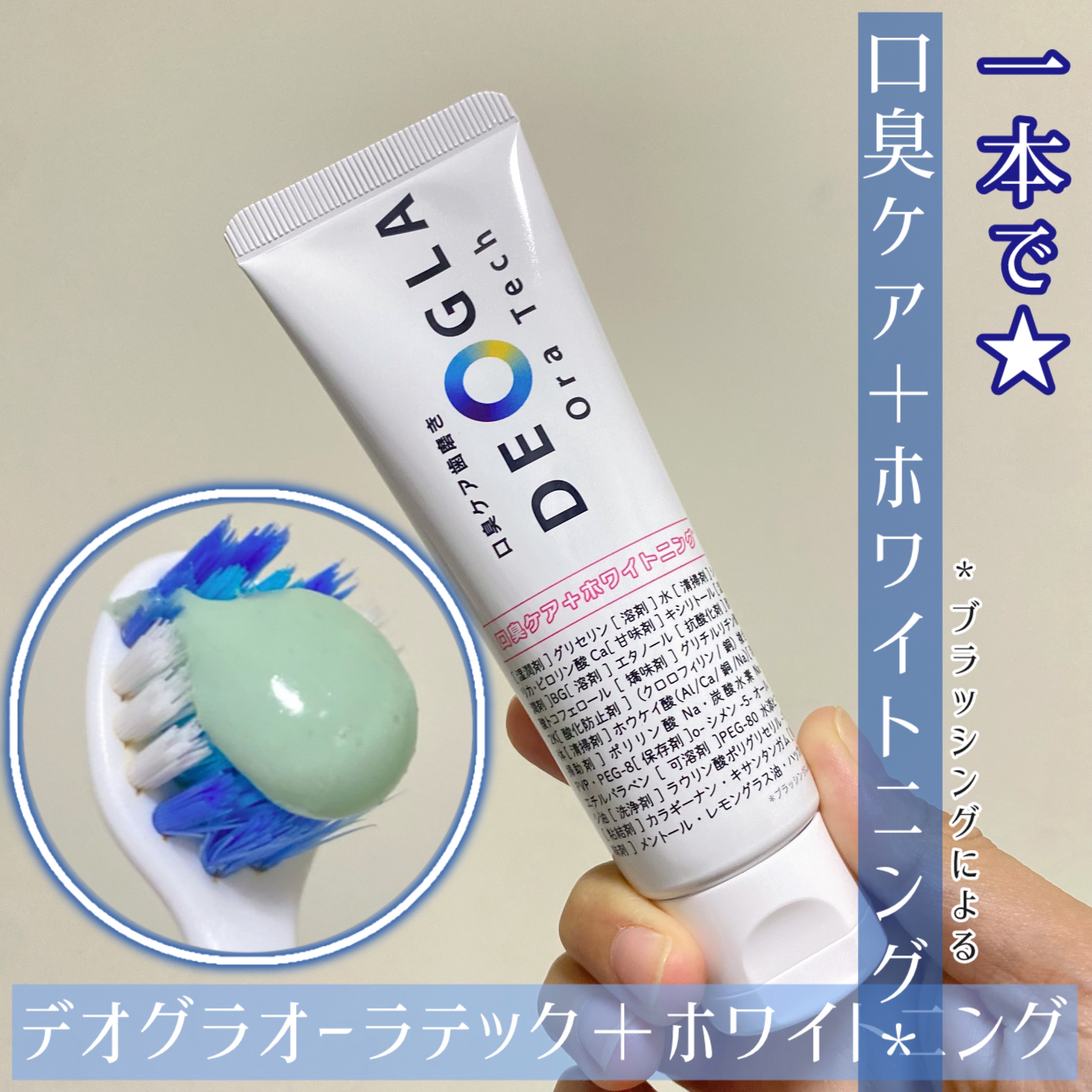 - \独自成分「DEOGLA®︎」(清掃剤)配合/ 創業200年を超える素材メーカーがつくる口臭ケアに特化した歯磨き粉! 製品の特長: 多数のご要望をいただいていた、口臭とホワイトニング *を1本でケアいただけます。ホワイトニング *はもちろん、独自成分DEOGLA配合で口臭にアプローチ。 徹底的にこだわった成分を配合しているので、口臭ケアとしてだけでなくお口のトータルケアにご活用ください。 ミントが苦手な方にもおすすめな、レモングラス香味、控え目な泡立ちでしっかりとブラッシングしていただけます。 ▶独自成分DEOGLA : 化粧品成分名称 ホウケイ酸(Al/Ca/銅/Na) *ブラッシングによる