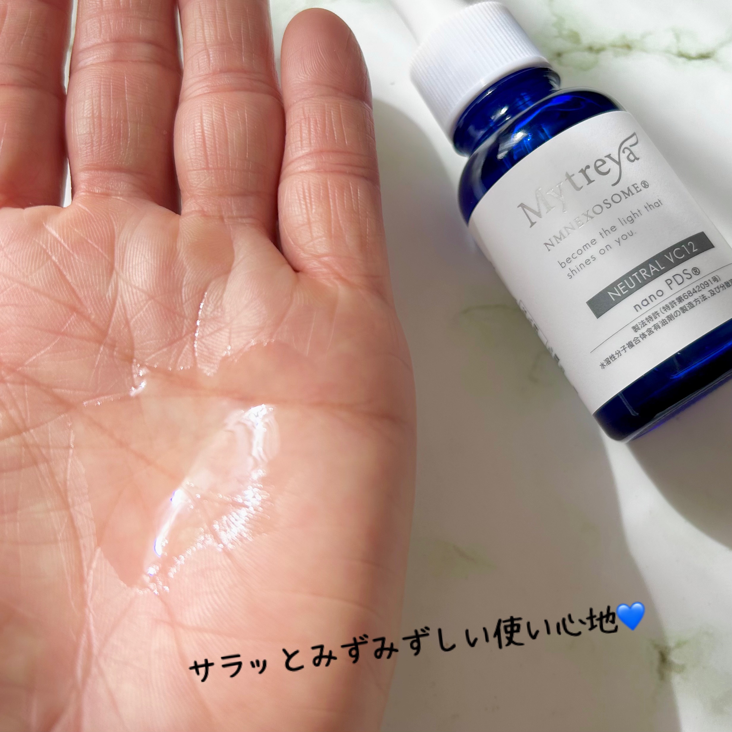- ①高分子ヒアルロン酸を新配合 化粧品で多く使用されている低分子ヒアルロン酸と異なり、高分子ヒアルロン酸は美容医療の現場で使われており、注射などによって注入する施術が一般的です。 高分子ヒアルロン酸は高い保水力があり、乾燥から肌を守り、キメを整えるサポートをしてくれます。 ただしヒアルロン酸は「水溶性成分」であり、低分子ヒアルロン酸であっても「数千~数万ダルトン(*1)」はあります。 そのため通常は肌表面のバリアで弾かれ表面に留まり浸透しません。 ですがMytreyaのNEUTRAL VC12はnanoPDS化した高分子ヒアルロン酸を新たに配合しました。 nanoPDSの技術によって水溶性成分であったとしても、肌表面に留まらず浸透(*2)します。 また100万ダルトン(*1)以上もある高分子ヒアルロン酸の「立体構造を壊すことなく」肌に浸透(*2)させることが可能です。 *1 ダルトンは分子量の単位 *2 角層まで ②ビタミンCとビタミンC誘導体の新配合比率 最新のエイジングケア研究から導き出した新配合比率でビタミンCを配合しました。 NEUTRAL VC12はnanoPDS化した「肌に浸透(*1)するビタミンC誘導体」と、「肌表面に留まるビタミンC」との配合割合を最新の研究をもとに調整しました。 ビタミンCをあえて肌表面に留まらせることで、肌表面のエイジングケアをサポートします。 またビタミンCでありながらpHは中性を保っていますので、VC37と同様にピリピリしにくく敏感肌の方でもお試しいただけます。 *1 角層まで ③さっぱりとした使用感 nanoPDS化し肌に浸透(*1)させることでべたつきを軽減しております。 ビタミンC濃度を12%にしていることでテクスチャーは37%よりさっぱりしており、他のスキンケア化粧品との組み合わせやすさも実現しています。 *1 角層まで その他の特徴 ・ビタミンC+ビタミンC誘導体濃度が「12%」 ・敏感肌でもピリピリしない「中性」 ・新世代皮膚浸透技術「nanoPDS」採用 ・nanoPDS化された水溶性成分「ビタミンC」「ビタミンC誘導体」配合 ・nanoPDS化されたエイジングケア水溶性成分「L体 β-NMN」配合 ・純度92.995%の「精製幹細胞エクソソーム(幹細胞培養液や幹細胞上清液でない)」配合 ・成分を壊さない「非加熱製法」 ・一般社団法人「次世代吸収研究会認定」商品 ・シリコーン・合成ポリマー・カオチン界面活性剤・石油系界面活性剤・紫外線吸収剤・鉱物油・有機溶剤・合成香料・合成着色料・パラベン・サルフェート・エタノール・プロピレングリコール・ミネラルオイル・動物性原料(*1)・旧表示指定成分・酸化防止剤 不使用 *1 哺乳類(ヒトを除く)・鳥類・魚類・乳・卵・ハチミツ等