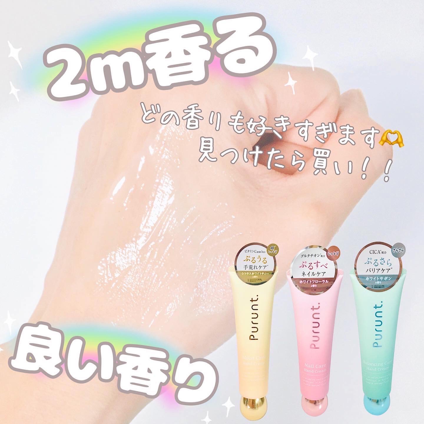 香水シャンプーとして人気のプルントがヘアケアの香りをハンドケアに✨ 半径2メートルの人をきゅんとさせるふわんと香水ハンドクリームです🤍 貯水パック処方の手荒れケア✨ シトラスホワイトティーの香り💛 こっくりとしたテクスチャーでとてもしっとりとしたつけ心地🤍 パッケージがとても可愛くて 3種類とも香りもつけ心地も良くその日の気分で使い分けできるので嬉しいです😊