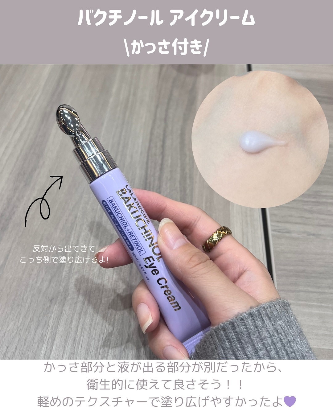 シワやくすみに特化しています✨ 新商品をLALARECIPEさんの公式Instagramで見ていて気になっていたら アイクリームのテクスチャーはしっとり系のこっくりクリーム🤍 だけどベタつきがまったくないです🫶🏻 年齢が出やすいところに使えるのが魅力的💜 説明してくれたお姉さんたちも皆さん肌がピカピカ綺麗で🥺💕