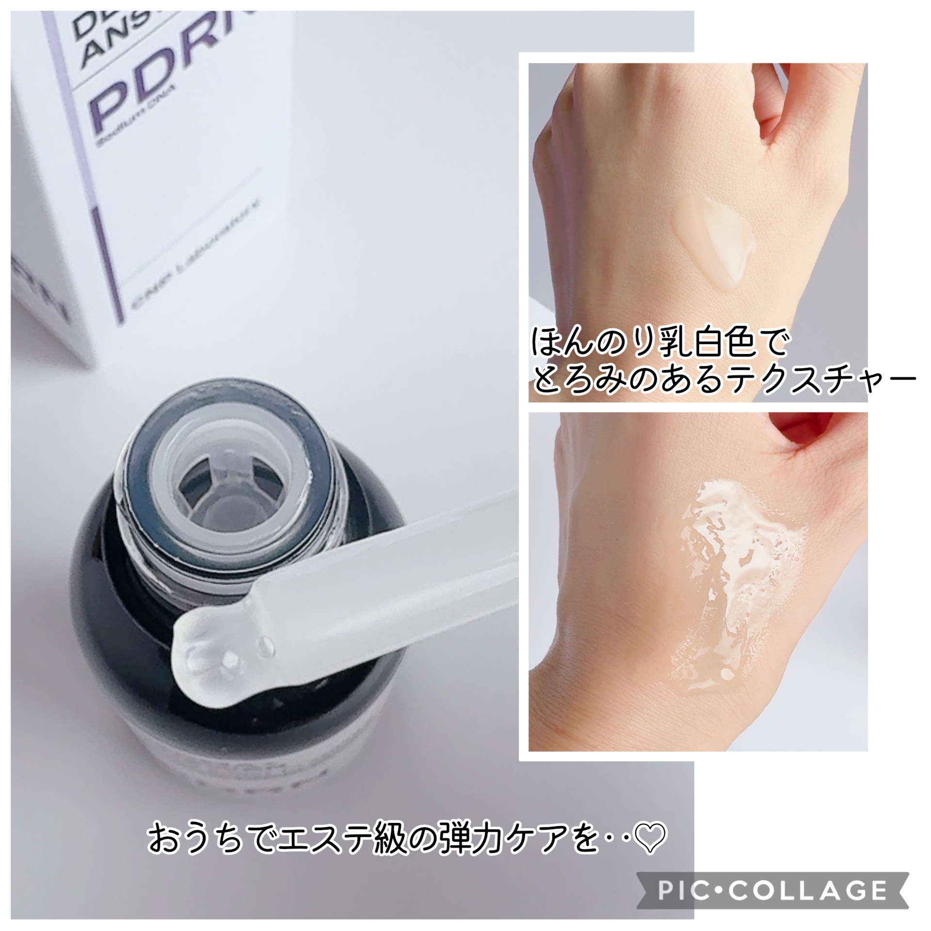 PDRNはエステのサーモン注射、水光注射の施術に使われてる高級原料✨ 肌の奥から弾力あるツヤ肌が目指せます。 とろみがあって濃厚なテクスチャー肌に滑らせるとすーっとなじみます。