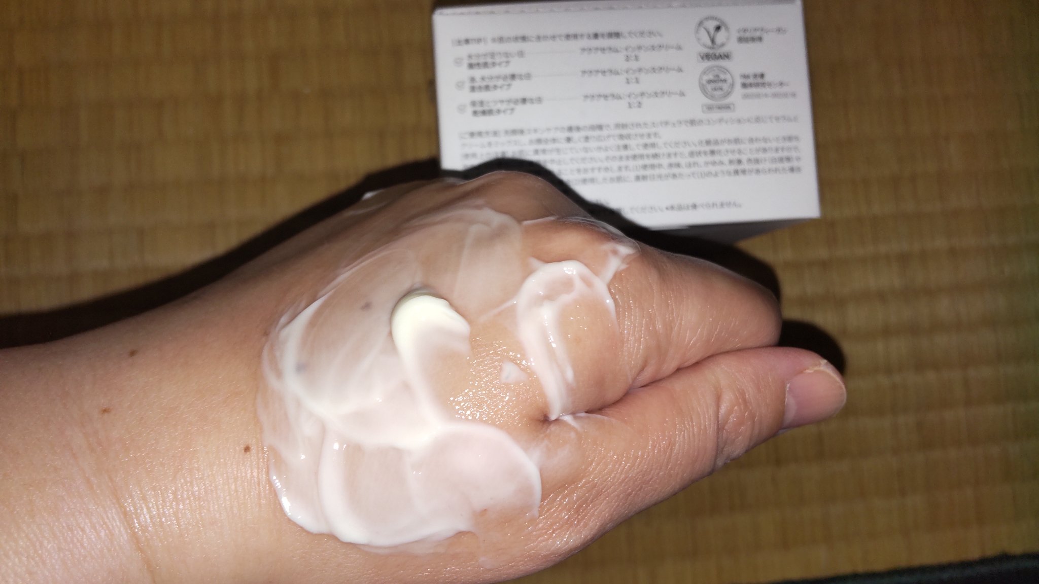 - アクサセラムとインテンスクリームのデュアル・フォーミュラで肌のタイプやコンディションに合わせて 比率を調節してカスタマイズ・ケアします。 ・アクアセラム:ヒアルロン酸、パンテノール、ツボクサエキス*が含まれた、さっぱりとした使用感で肌に水分を与え肌のキメを整えます。*ヒアルロン酸・パンテノール・ツボクサエキス(いずれも保湿成分) ・インテンスクリーム:イタリア産ホワイトトリュフ*が含まれた、もっちりした使用感で肌にうるおいを与えツヤのあるもち肌へ導きます。*ツベルマグナツムエキス(保湿成分) イタリアヴィーガン認証V-LABEL取得 皮膚低刺激テスト済み *全ての方に皮膚刺激が発生しないということではありません。 【使い方】 1. 洗顔後、スパチュラで肌のコンディションによって、セーラムとクリームを適量を取り、 ミックスしてから顔全体に優しく塗り広げ、 吸収させます。※ 必要に応じて、アクアセラムとインテンスクリームは単品でも使用できます。 【使用上の注意】 お肌に異常が生じていないかよく注意して使用してください。化粧品がお肌に合わないとき即ち次のような場合には、使用を中止してください。そのまま使用を続けますと、症状を悪化させることがありますので、皮ふ科専門医等にご相談されることをおすすめします。 (1)使用中、赤味、はれ、かゆみ、刺激、色抜け(白斑等)や黒ずみ等の異常があらわれた場合 (2)使用したお肌に、直射日光があたって(1)のような異常があらわれた場合
