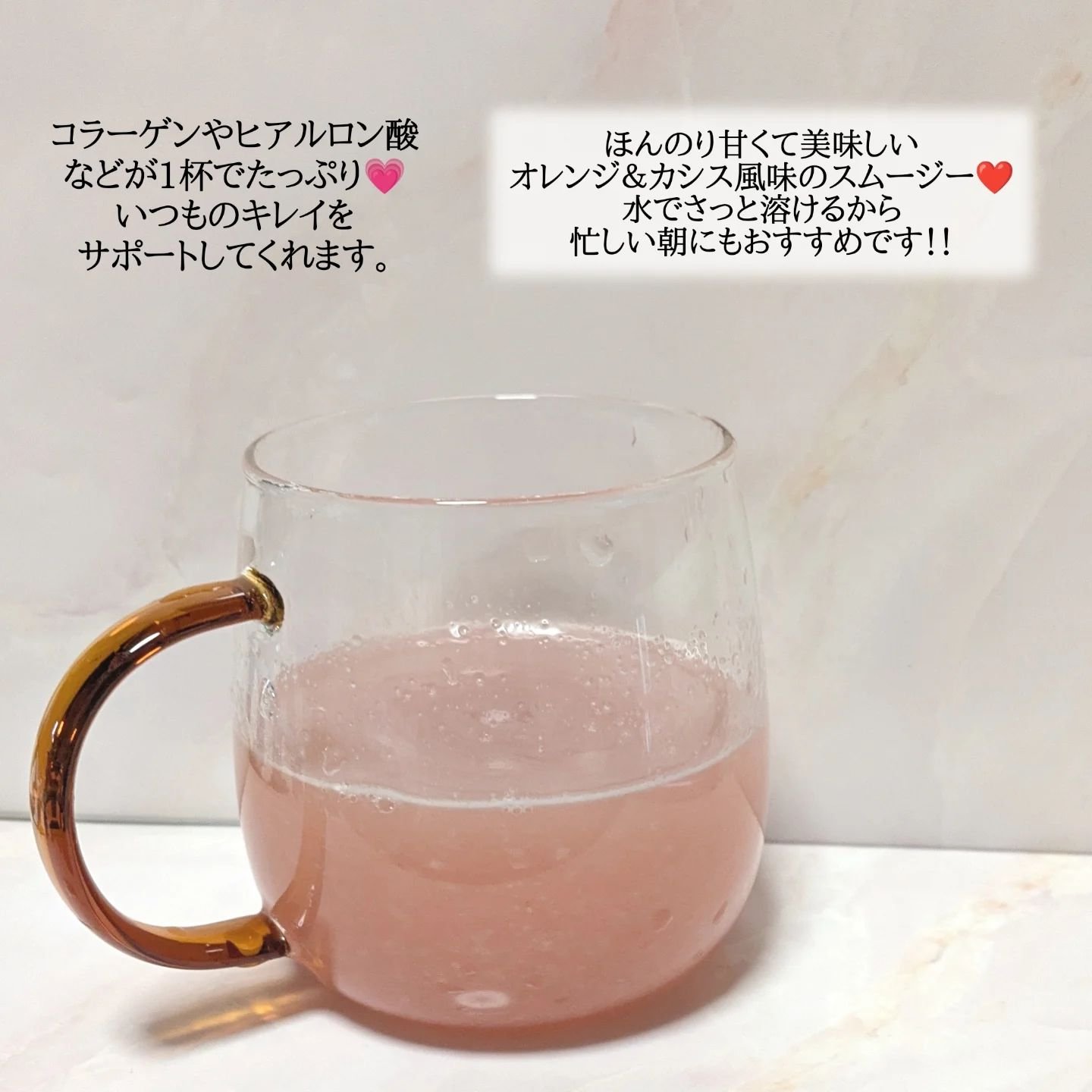 水に溶かすだけのお手軽スムージー💡 低分子コラーゲンやヒアルロン酸など、いつものキレイをサポートしてくれます😌🌸 オレンジ&カシス風味🍊🫐 ほどよい酸味とどちらかというと、カシスよりな印象。 手軽に栄養摂取したい方にオススメかと思います💡