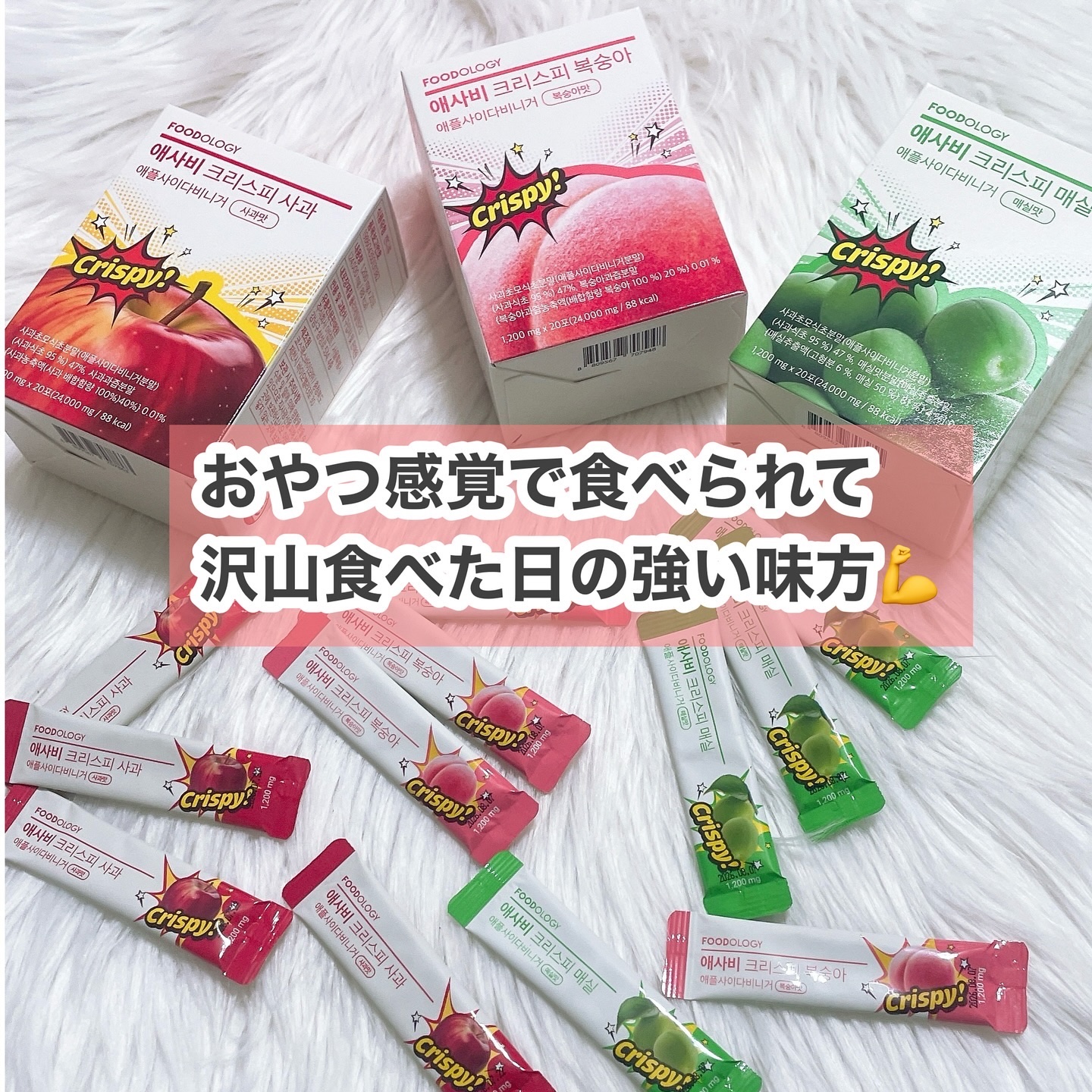健康を第一に考える韓国のインナービューティーブランド、Foodology(フードオロジー)。韓国No.1のダイエットサポート*¹、赤筒ダイエットのコレオロジーが有名なブランドさん。 水なしで楽しめちゃう🥰 ちょっぴり甘酸っぱい感じのリンゴ酸味に、それぞれのフレーバーがプラス。 100%オーガニック イギリス産のアップルサイダービネガー原液を使用。核心成分「酵母(マザー)が47%圧縮されて入ってるんですって✨✨