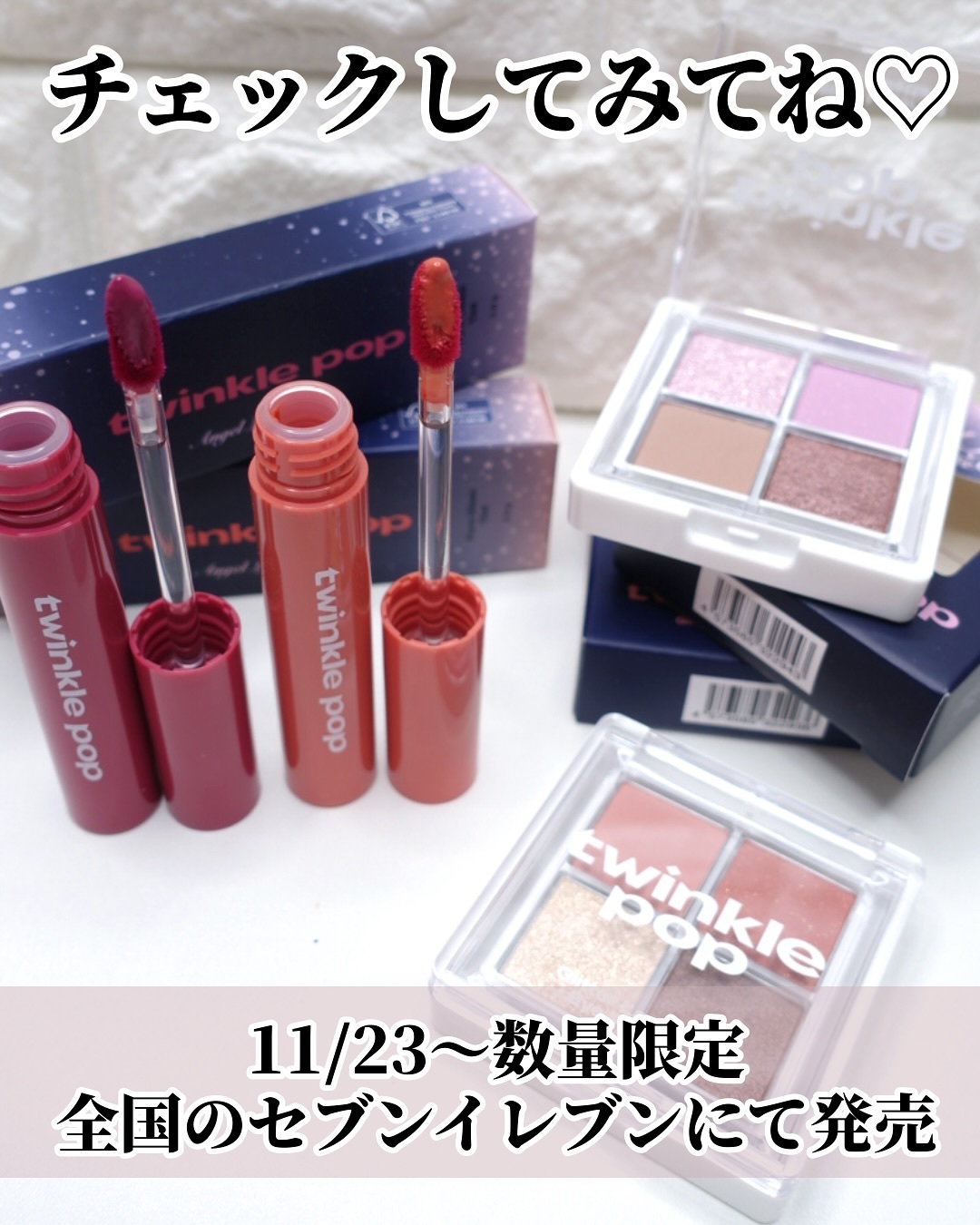 CLIOのコスメが買えるようになるらしい🧡 セブンイレブンで展開しているCLIO姉妹ブランド。11/23から秋冬限定色発売。 アイシャドウパレットは、必要な4色がギュッと詰まったパレットだよ。簡単に使いやすいアイシャドウパレット細かい粒⼦で粉⾶びしにくいよ。 ティントは、水分テクスチャーでベタつき感じずぴったり密着してくれるよ。ボリューム感もでる艶ティントで可愛い🧡