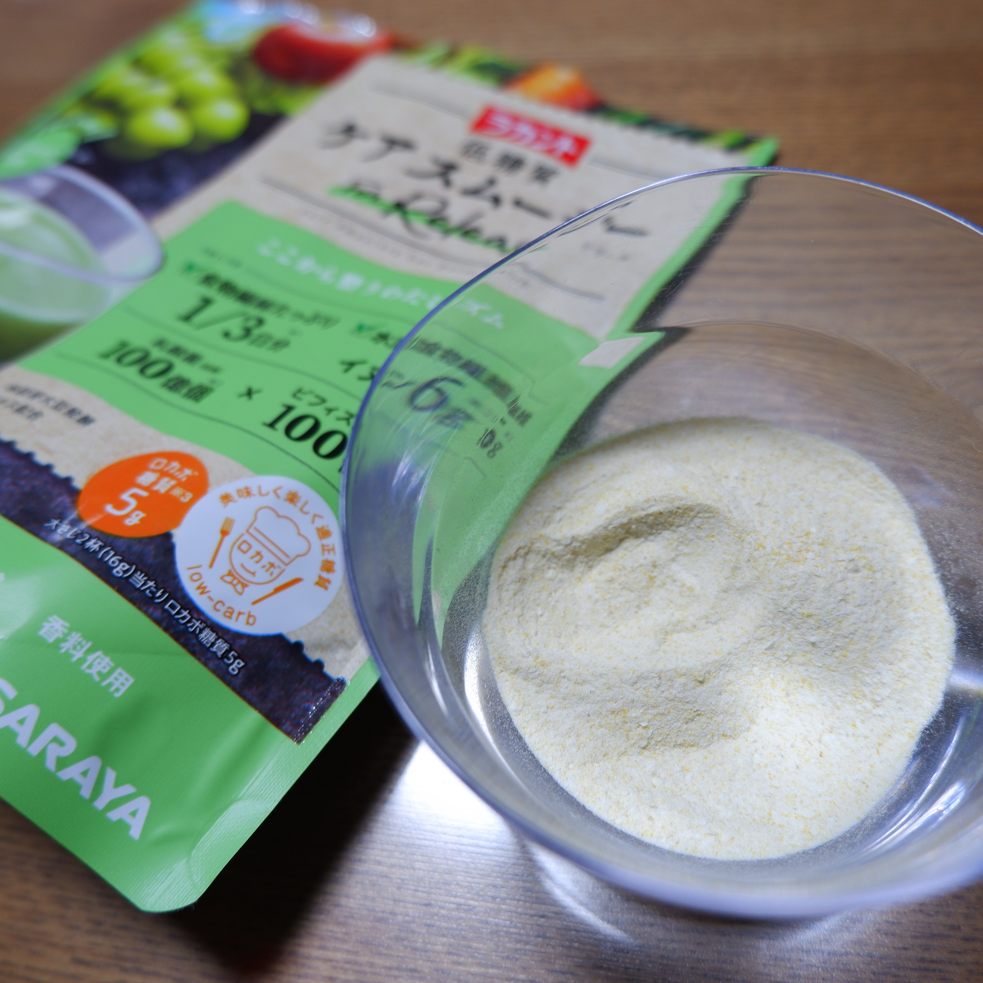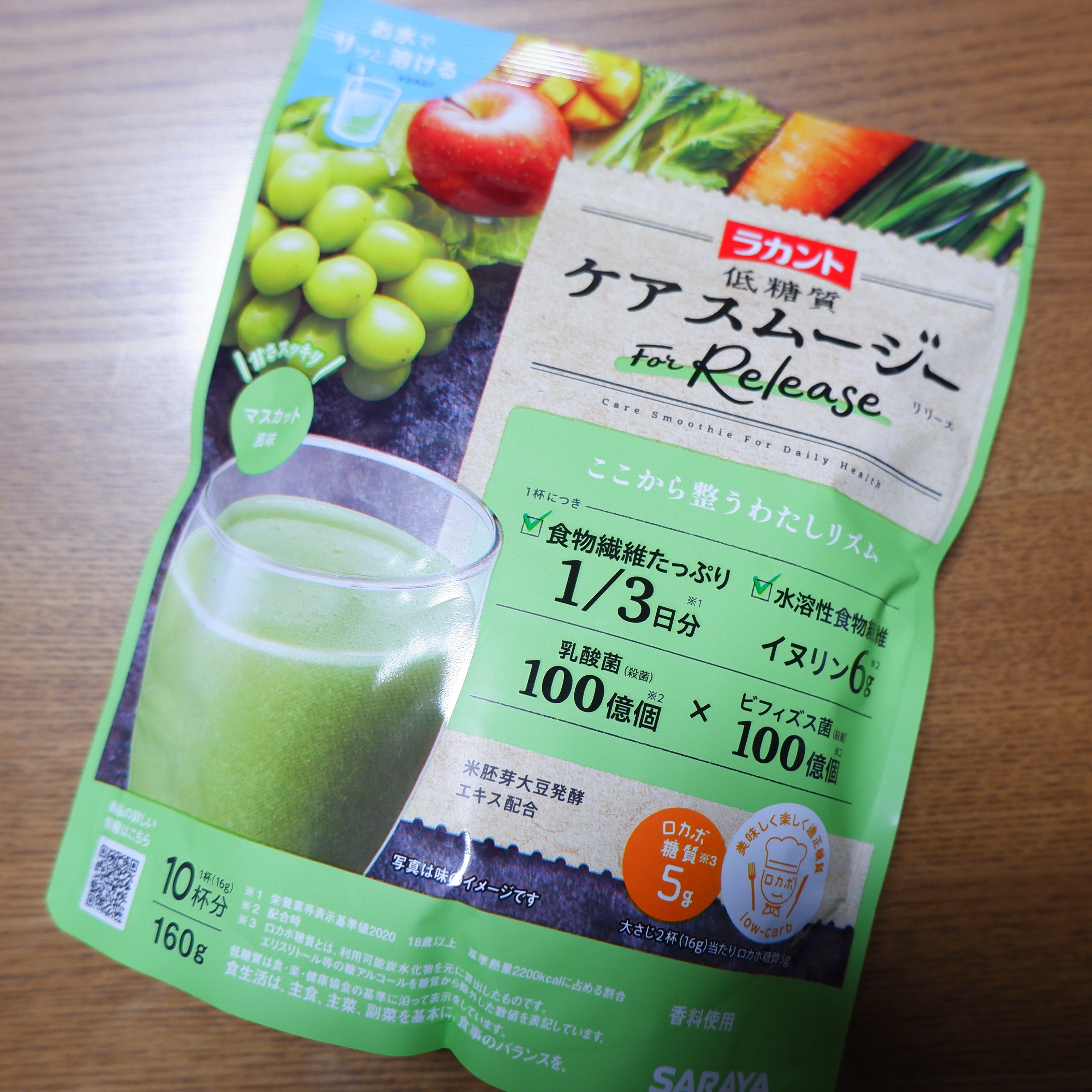 欲しい栄養を1杯にギュッとブレンドした、フルーティーで飲みやすい粉末タイプの低糖質スムージーのラカント 低糖質ケアスムージー リリース160g(マスカット風味)を飲んでみました。 1/3日分の食物繊維(イヌリン入り)をたっぷり配合して、さらに乳酸菌(殺菌)100億個やビフィズス菌(殺菌)100億個を配合し、毎朝のリズムをサポートしてくれるんだそうです。 粉末は水にも溶けやすいので、シェーカーを持っていなくてもコップでかき混ぜるだけで、スムージーが出来るのは嬉しいです。