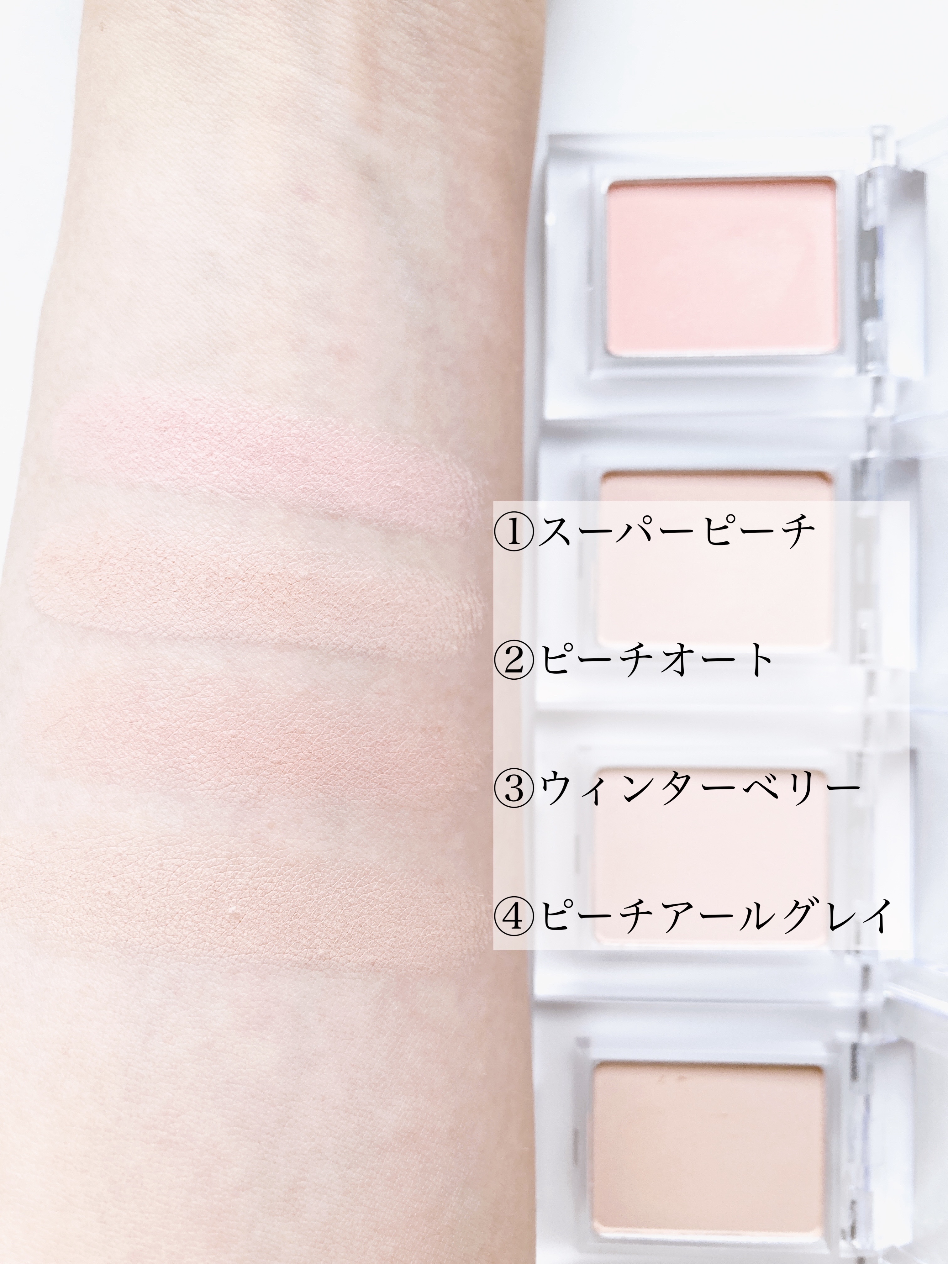 抜け感のある上品なピンクグレージュというだけあって、全て淡い色でキレイなくすみピンク 左上のキラキララメのみ透け感がありますが、こちらのラメもギラギラした感じではなく上品なキラキラで 普段使いにはさりげなく おでかけには涙袋にしっかり入れても可愛いと思いました 全体的に淡くて優しい発色ですが、重ねるとしっかりグラデーションができます それぞれの色が優しい色味なので、単色使いや部分使い、他のアイシャドウとの組み合わせなど 色んな使い方ができそうです!