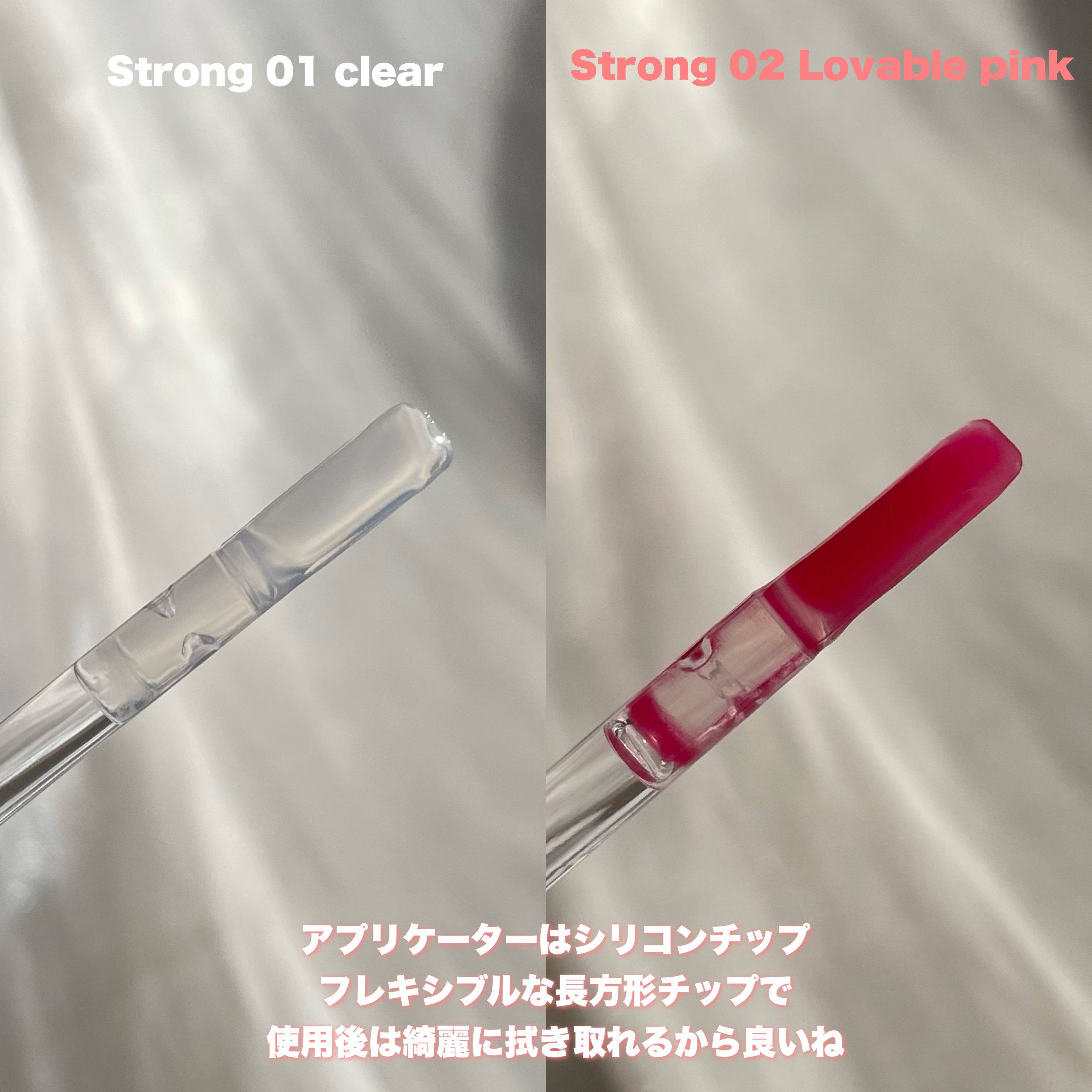 - <ベーシック 01 クリア> 水添ポリイソブテン、リンゴ酸ジイソステアリル、トリ(カプリル酸/カプリン酸)グリセリル、ヒドロキシステアリン酸エチルヘキシル、オクチルドデカノール、ジメチルシリル化シリカ、バニリルブチル、1,2-ヘキサンジオール、マイクロクリスタリンワックス、トリ脂肪酸(C10-18)グリセリル、乳酸メンチル、ヒアルロン酸Na、トリオレイン、香料、ジオレイン酸グリセリル <ストロング 01 クリア> 水添ポリイソブテン、リンゴ酸ジイソステアリル、トリ(カプリル酸/カプリン酸)グリセリル、ヒドロキシステアリン酸エチルヘキシル、オクチルドデカノール、バニリルブチル、ジメチルシリル化シリカ、1,2-ヘキサンジオール、マイクロクリスタリンワックス、乳酸メンチル、トリ脂肪酸(C10-18)グリセリル、ヒアルロン酸Na、トリオレイン、香料、ジオレイン酸グリセリル <ストロング 02 ラバブルピンク> 水添ポリイソブテン、リンゴ酸ジイソステアリル、ヒドロキシステアリン酸エチルヘキシル、トリ(カプリル酸/カプリン酸)グリセリル、オクチルドデカノール、バニリルブチル、ジメチルシリル化シリカ、乳酸メンチル、マイクロクリスタリンワックス、1,2-ヘキサンジオール、トリ脂肪酸(C10-18)グリセリル、ヒアルロン酸Na、トリオレイン、香料、ジオレイン酸グリセリル、酸化チタン、赤202、黄4、赤104(1)、黄5 <ストロング 03 プリティコーラル> 水添ポリイソブテン、リンゴ酸ジイソステアリル、ヒドロキシステアリン酸エチルヘキシル、トリ(カプリル酸/カプリン酸)グリセリル、オクチルドデカノール、バニリルブチル、ジメチルシリル化シリカ、マイクロクリスタリンワックス、1,2-ヘキサンジオール、乳酸メンチル、トリ脂肪酸(C10-18)グリセリル、ヒアルロン酸Na、トリオレイン、香料、ジオレイン酸グリセリル、酸化チタン、黄5、赤202、酸化鉄、黄4