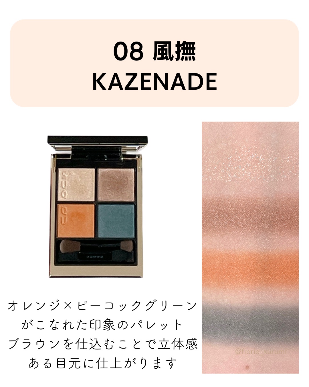 - <01 瑞花 -MIZUHANA> マイカ、合成フルオロフロゴパイト、タルク、ジメチコン、ジフェニルシロキシフェニルトリメチコン、ラウロイルグルタミン酸ジ(フィトステリル/オクチルドデシル)、シリカ、(ジメチコン/ビニルジメチコン)クロスポリマー、ジステアリン酸Al、ミリスチン酸Mg、リンゴ酸ジイソステアリル、ミリスチン酸亜鉛、ステアロイルグルタミン酸2Na、イソステアリン酸ソルビタン、メチコン、水酸化Al、ホホバ種子油、シア脂、カニナバラ果実油、ラウロイルグルタミン酸ジ(オクチルドデシル/フィトステリル/ベヘニル)、ヒアルロン酸Na、クロルフェネシン、デヒドロ酢酸Na、(+/-)アルミナ、グンジョウ、コンジョウ、酸化チタン、酸化鉄、酸化スズ、ホウケイ酸(Ca/Al)、黄4、赤202、赤226 <02 陽香色 -YOUKOUIRO> マイカ、合成フルオロフロゴパイト、タルク、ジメチコン、ジフェニルシロキシフェニルトリメチコン、ラウロイルグルタミン酸ジ(フィトステリル/オクチルドデシル)、シリカ、(ジメチコン/ビニルジメチコン)クロスポリマー、ジステアリン酸Al、ミリスチン酸Mg、リンゴ酸ジイソステアリル、ミリスチン酸亜鉛、ステアロイルグルタミン酸2Na、イソステアリン酸ソルビタン、メチコン、水酸化Al、ホホバ種子油、シア脂、カニナバラ果実油、ラウロイルグルタミン酸ジ(オクチルドデシル/フィトステリル/ベヘニル)、ヒアルロン酸Na、クロルフェネシン、デヒドロ酢酸Na、(+/-)アルミナ、グンジョウ、コンジョウ、酸化チタン、酸化鉄、酸化スズ、ホウケイ酸(Ca/Al)、黄4、赤202、赤226 <03 光暮 -HIKARIGURE> マイカ、タルク、合成フルオロフロゴパイト、ジメチコン、ジフェニルシロキシフェニルトリメチコン、ラウロイルグルタミン酸ジ(フィトステリル/オクチルドデシル)、シリカ、(ジメチコン/ビニルジメチコン)クロスポリマー、ジステアリン酸Al、ミリスチン酸Mg、リンゴ酸ジイソステアリル、ミリスチン酸亜鉛、ステアロイルグルタミン酸2Na、イソステアリン酸ソルビタン、水酸化Al、ホホバ種子油、シア脂、カニナバラ果実油、ラウロイルグルタミン酸ジ(オクチルドデシル/フィトステリル/ベヘニル)、ヒアルロン酸Na、クロルフェネシン、デヒドロ酢酸Na、(+/-)アルミナ、酸化チタン、酸化鉄、酸化スズ、ホウケイ酸(Ca/Al)、赤226 <04 純撫子 - SUMINADESHIKO> マイカ、合成フルオロフロゴパイト、タルク、ジメチコン、ジフェニルシロキシフェニルトリメチコン、ラウロイルグルタミン酸ジ(フィトステリル/オクチルドデシル)、シリカ、(ジメチコン/ビニルジメチコン)クロスポリマー、ジステアリン酸Al、ミリスチン酸Mg、リンゴ酸ジイソステアリル、ミリスチン酸亜鉛、ステアロイルグルタミン酸2Na、イソステアリン酸ソルビタン、メチコン、水酸化Al、ホホバ種子油、シア脂、カニナバラ果実油、ラウロイルグルタミン酸ジ(オクチルドデシル/フィトステリル/ベヘニル)、ヒアルロン酸Na、クロルフェネシン、デヒドロ酢酸Na、(+/-)アルミナ、グンジョウ、コンジョウ、酸化チタン、酸化鉄、酸化スズ、ホウケイ酸(Ca/Al)、黄4、赤202、赤226 <05 緋影 - AKEKAGE> マイカ、合成フルオロフロゴパイト、タルク、ジメチコン、ジフェニルシロキシフェニルトリメチコン、ラウロイルグルタミン酸ジ(フィトステリル/オクチルドデシル)、シリカ、(ジメチコン/ビニルジメチコン)クロスポリマー、ジステアリン酸Al、ミリスチン酸Mg、リンゴ酸ジイソステアリル、ミリスチン酸亜鉛、ステアロイルグルタミン酸2Na、イソステアリン酸ソルビタン、メチコン、水酸化Al、ホホバ種子油、シア脂、カニナバラ果実油、ラウロイルグルタミン酸ジ(オクチルドデシル/フィトステリル/ベヘニル)、ヒアルロン酸Na、クロルフェネシン、デヒドロ酢酸Na、(+/-)アルミナ、グンジョウ、コンジョウ、酸化チタン、酸化鉄、酸化スズ、ホウケイ酸(Ca/Al)、黄4、赤202、赤226 <06 深奏 - FUKAKANADE> マイカ、合成フルオロフロゴパイト、タルク、ジメチコン、ジフェニルシロキシフェニルトリメチコン、ラウロイルグルタミン酸ジ(フィトステリル/オクチルドデシル)、シリカ、(ジメチコン/ビニルジメチコン)クロスポリマー、ジステアリン酸Al、ミリスチン酸Mg、リンゴ酸ジイソステアリル、ミリスチン酸亜鉛、ステアロイルグルタミン酸2Na、イソステアリン酸ソルビタン、メチコン、水酸化Al、ホホバ種子油、シア脂、カニナバラ果実油、ラウロイルグルタミン酸ジ(オクチルドデシル/フィトステリル/ベヘニル)、ヒアルロン酸Na、クロルフェネシン、デヒドロ酢酸Na、(+/-)アルミナ、グンジョウ、コンジョウ、酸化チタン、酸化鉄、酸化スズ、ホウケイ酸(Ca/Al)、黄4、赤202、赤226 <08 風撫 -KAZENADE-> マイカ、タルク、合成フルオロフロゴパイト、ジフェニルシロキシフェニルトリメチコン、ジメチコン、ワセリン、ラウロイルグルタミン酸ジ(フィトステリル/オクチルドデシル)、シリカ、リンゴ酸ジイソステアリル、ステアロイルグルタミン酸2Na、ミリスチン酸亜鉛、トリイソステアリン酸イ
