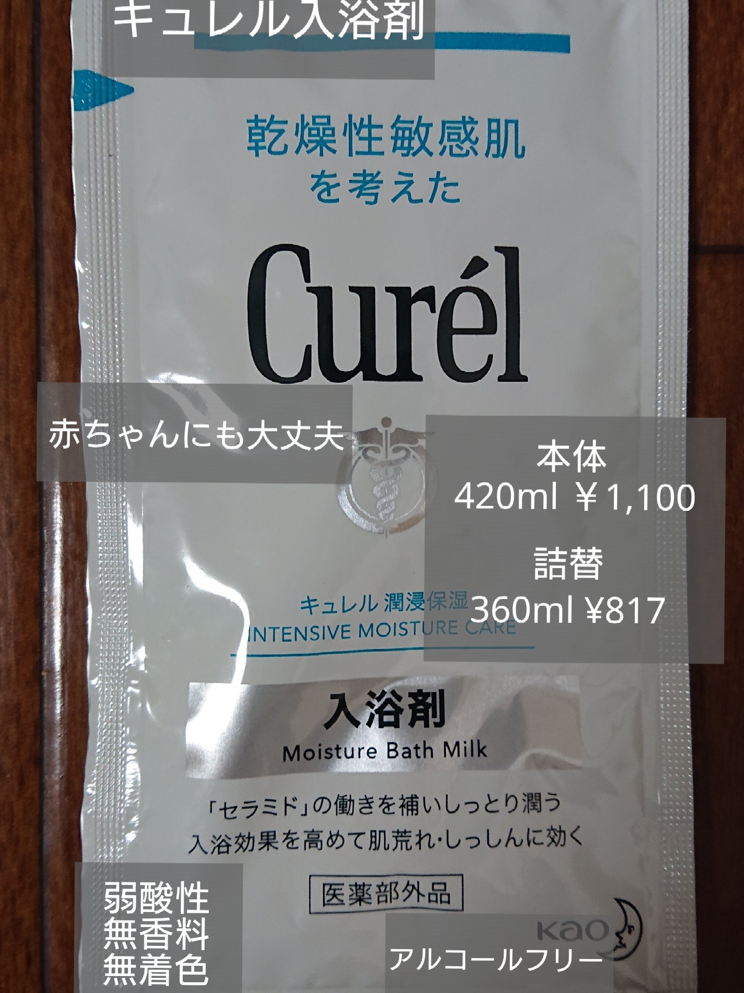 - 【敏感肌用】 ○潤い成分(セラミド機能成分*・ユーカリエキス)が、お風呂で膨潤した角層の深部まで浸透。カサつく肌もしっとり潤い、お風呂上りの乾燥を防ぎます。*ヘキサデシロキシPGヒドロキシエチルヘキサデカナミド ○入浴効果を高め、荒れ性・しっしんなどの肌にも効果があります。(コメ胚芽油配合) ○赤ちゃんのデリケートな肌にもお使いいただけます。 ○無香料・無着色・弱酸性・アルコールフリー (医薬部外品) 商品に関するお問い合わせ 受付時間9:00~17:00(土曜・日曜・祝日除く) *製品の誤飲・誤食など緊急の場合は、受付時間外でもお電話ください キュレル:0120-165-698