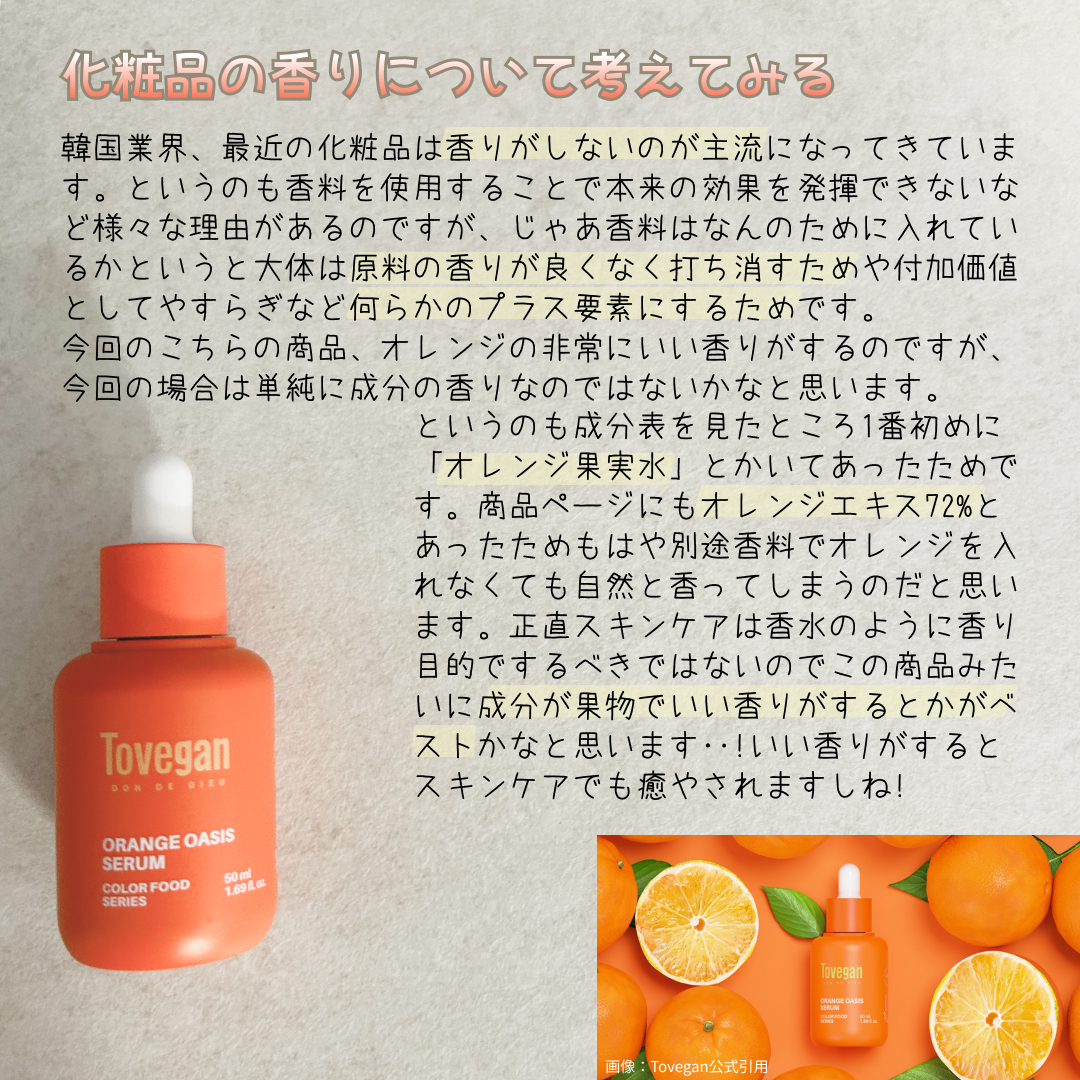 Tovegan様のまるでオレンジジュースのような見た目の可愛らしいトーンアップセラム🍊 ビタミンCと2種類のビタミンC誘導体を配合して美白やトーンアップ効果をアップグレード!✨️ オレンジエキス72.9%の高配合で肌の保湿力をしっかり高めながら毛穴を整えて肌を柔らかく滑らかにしてくれるんだそう!☝🏻 ̖́- オレンジオアシスセラムはみずみずしくサラッっとした使用感でお肌にぐんぐん馴染んでくれます!🍊
