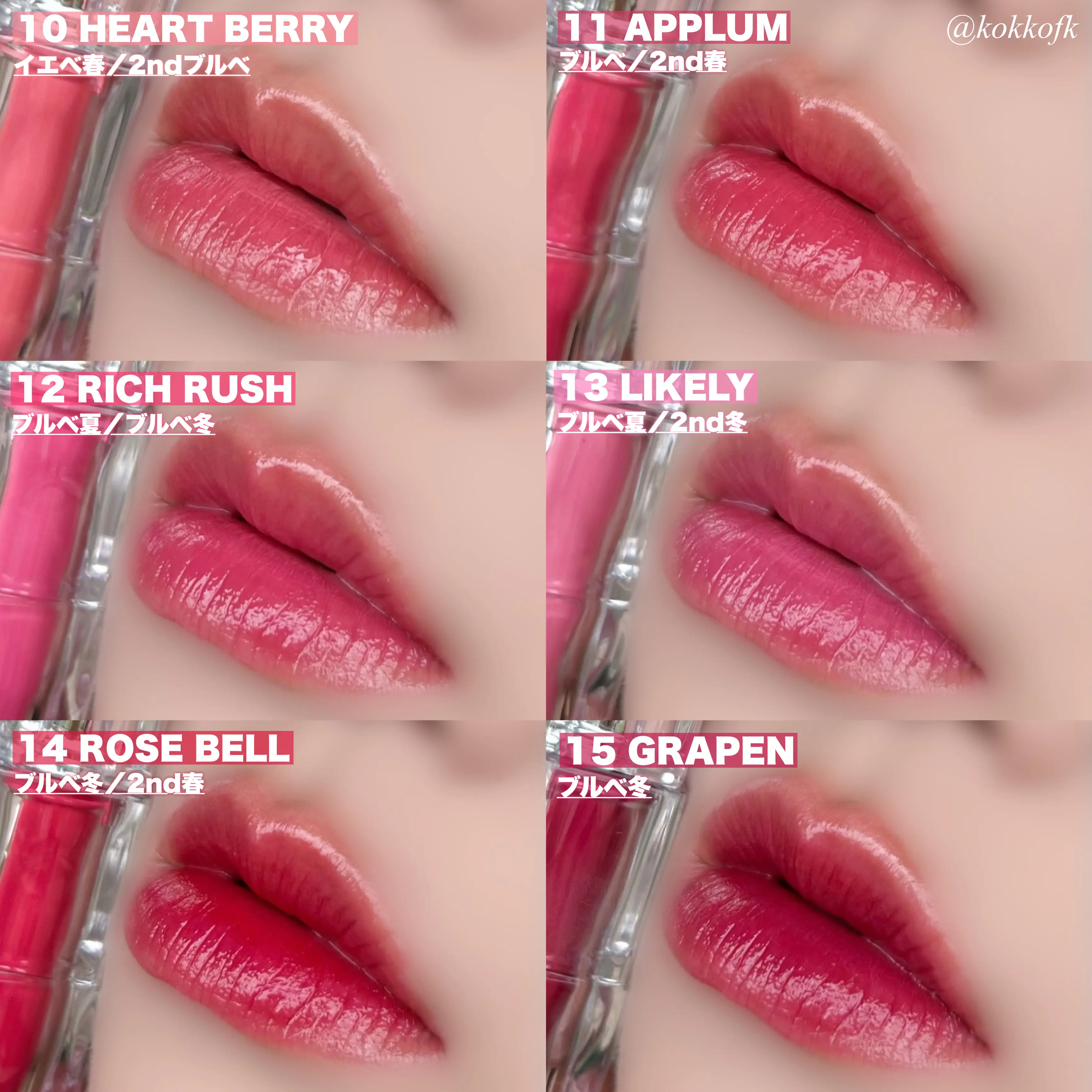 既存のジューシーラスティングティントよりさらに軽いツヤ感が魅力の新作ティント! 色選びの参考にしてね! やや黄みの明るいオレンジコーラル鮮やか得意なイエベ春におすすめ! 黄みの明るくまろやかなオレンジベージュ黄みが得意なイエベ春におすすめ! 青み黄み中間なくすみピンクベージュブルベ夏やイエベ春におすすめ 黄みの深くて鮮やかなオレンジレッド鮮やか得意なイエベ秋におすすめ! 青みの鮮やかで明るいビビッドピンク明るさ得意なブルベ冬やブルベ夏におすすめ! 青みの明るめで柔らかいローズピンクブルベ夏やブルベ冬におすすめ! 青み黄み中間な鮮やかで強いビビッドレッド2ndイエベ春のブルベ冬におすすめ! 青みの強い深くて鮮やかなベリーレッド2nd夏で鮮やか得意なブルベ冬におすすめ!