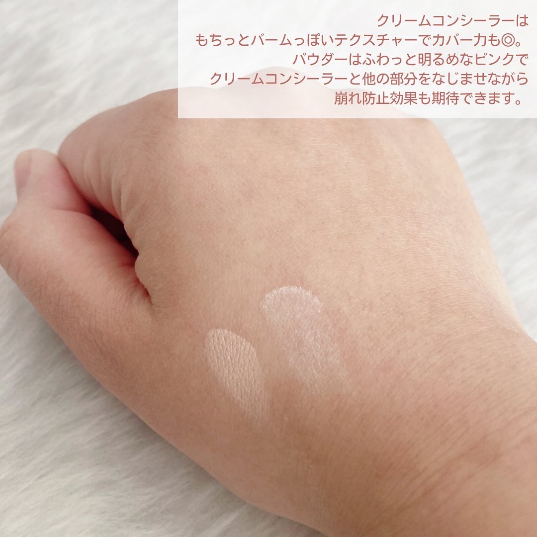 密着クリームテクスチャー:もっちりとしたクリームが肌に密着&肌悩みカバー ピンククリームバームのようなテクスチャーで、密着感が高く、ヨレにくいと思いました。 付属の扇形ブラシでサッとのせるだけで、クマが隠れ目の下が明るくなります。