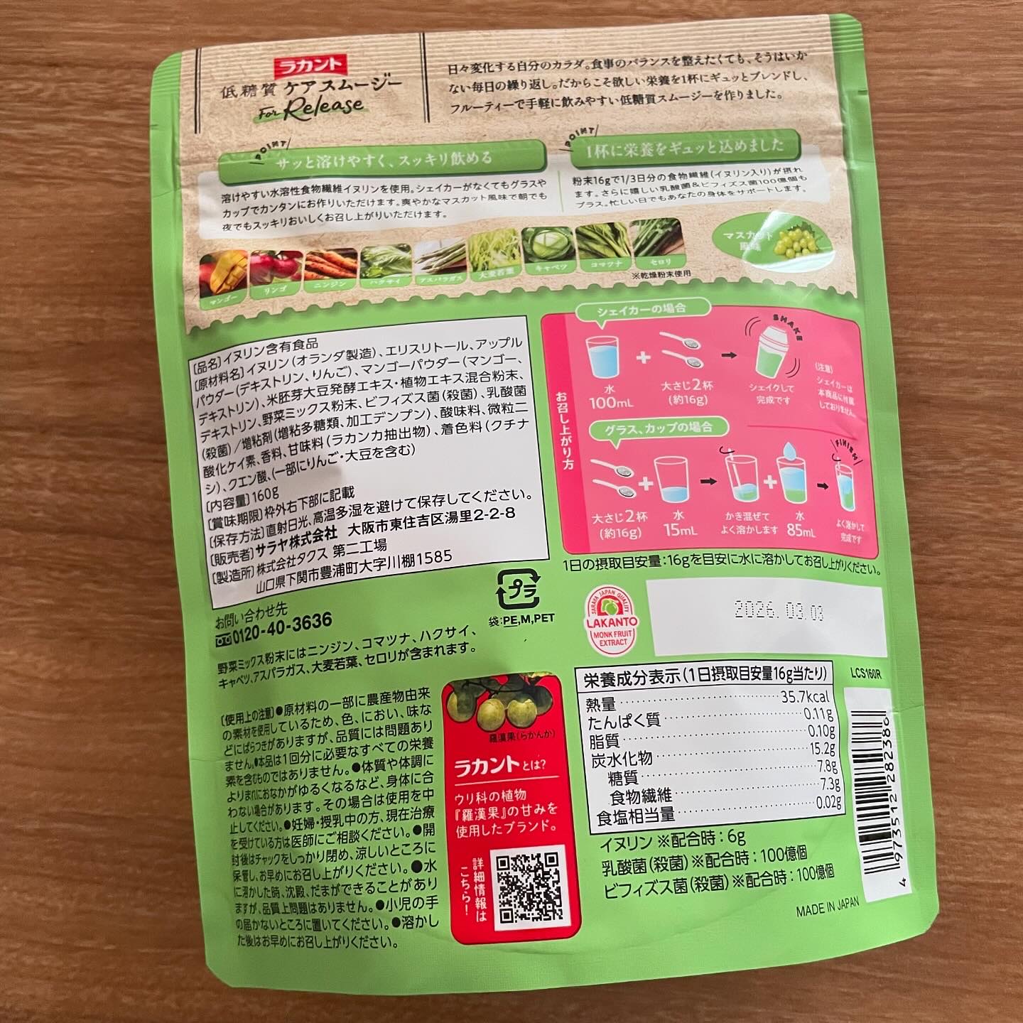 不足しがちな栄養を補給してくれる粉末スムージー「ラカント 低糖質ケアスムージー/リリース」を飲んでみました♪ 毎朝のリズムをサポートしてくれるという特徴があります。 開封するとフルーティーな香りがふわっと漂って飲んでもないのに美味しそうw
