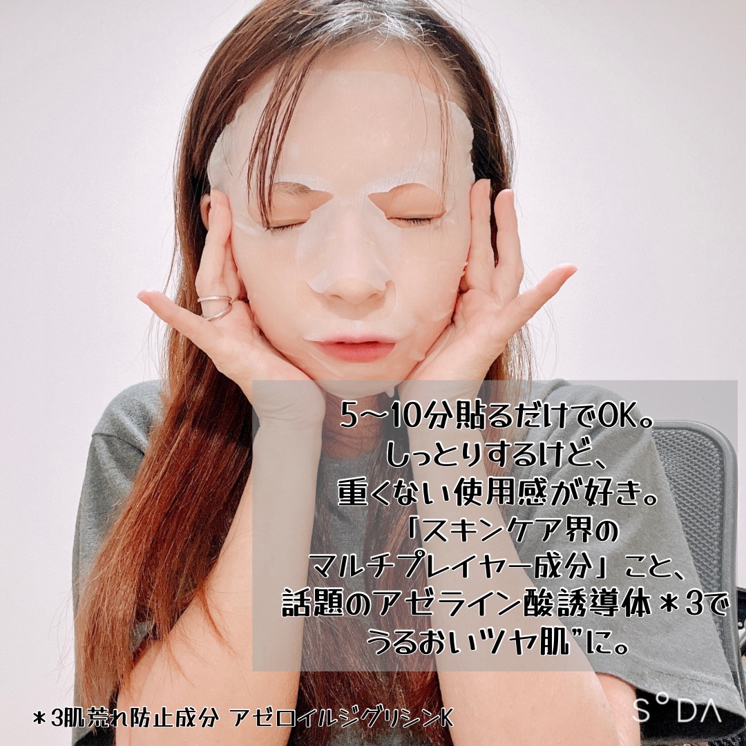 - 肌荒れ・皮脂ケア※1と健やかな肌の土台※2美容を叶える、アゼライン酸誘導体*1配合のうるおいツヤ肌管理マスクです。 肌荒れや肌の赤み、毛穴目立ちが気になる方に。 アゼライン酸*1×ナイアシンアミド*2+次世代ヒアルロン酸*3配合で、肌荒れをケアし、角質層をみずみずしいうるおいで満たします。 さらに肌表面でゆっくりと働くマイルドAHA*4が、古い角質をやわらげ、キメを整えることで、つるんとツヤめく素肌へ導きます。 シートはとろけるように肌に密着するメルティーフィールシートを採用。 シートが最も柔らかく感じられる液量を研究し、まるで水の層に包まれているような心地よさを実現しています。 (※1 ふき取りによる ※2 角質層のこと *1 肌荒れ防止成分 アゼロイルジグリシンK *2 整肌成分 *3 肌荒れ防止成分 加水分解ヒアルロン酸Na *4 整肌成分 マンデル酸)