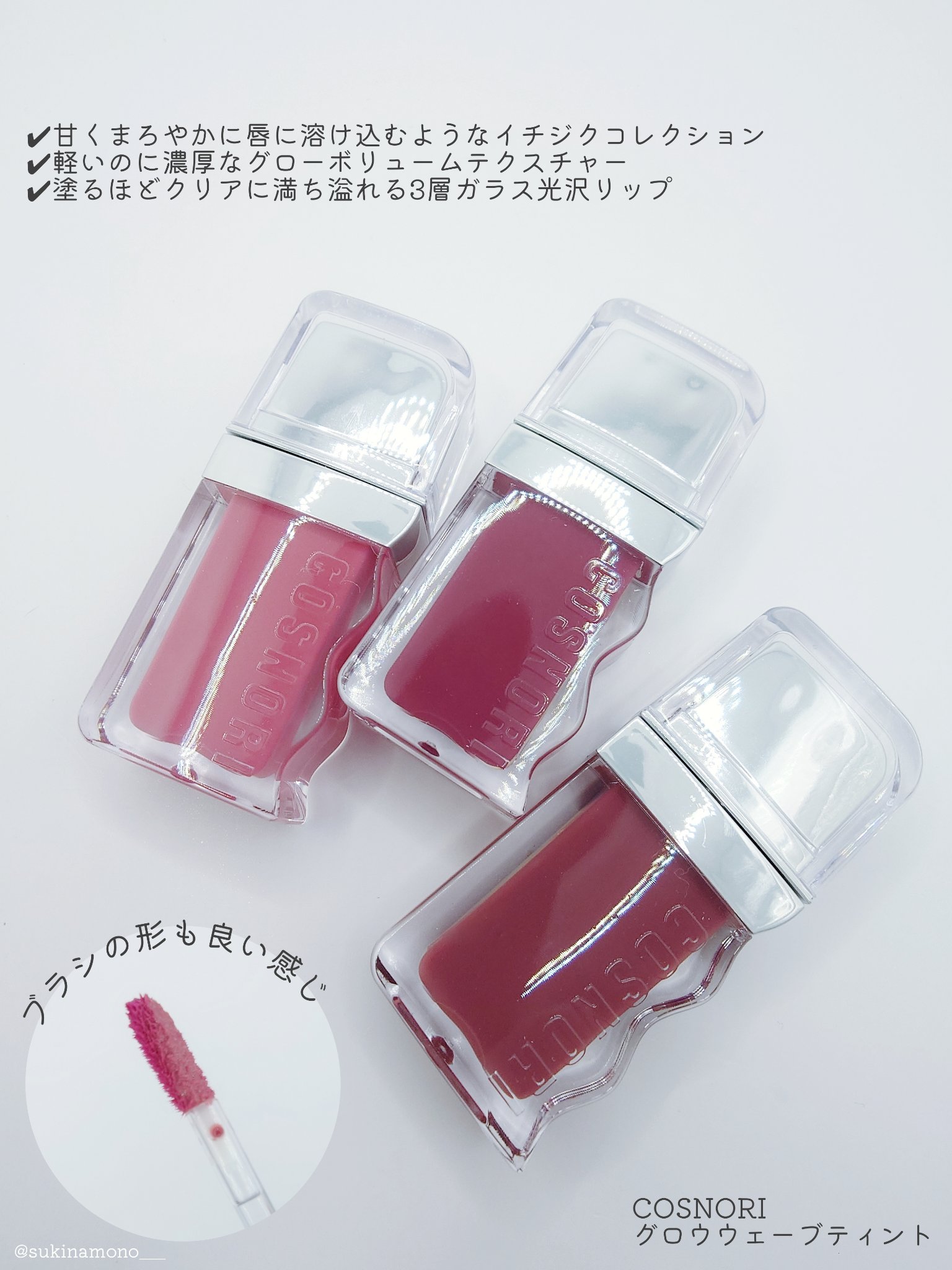 - クリアに満ち溢れる3層ガラス玉光沢がかわいい!コスノリからカラーリップが登場! 軽い付け心地なのにしっかりうるつや・ウォーターエッセンス38%とオイルのこだわりの配合率で、べたつかずに軽いフィッティングでツヤを演出します。 植物由来保湿オイルで唇にやさしい使い心地、しっとりした保湿効果が持続します。 1度塗りでシアーなナチュラルつや感、2.3度重ね塗りをすることで、ガラス玉のようなぽってり*うるツヤ唇へ導きます。 *メイク効果
