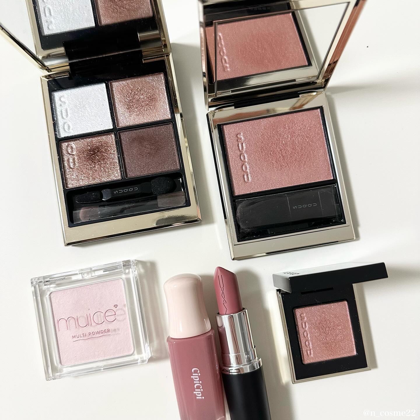 アイシャドウは実物の方が相当可愛い! 特に左上のラメの破壊力、、、 左側ボルドーは本当にふんわりと。 その上から右側のライラック?ピンクを 乗せると透明感爆発でした🥹👏🏻 本当にSUQQUは裏切らない可愛さ。 4月に発売されるもう一色のシグニチャーも、 5月発売のサマーもしっかり買うよ☺️❤️🔥