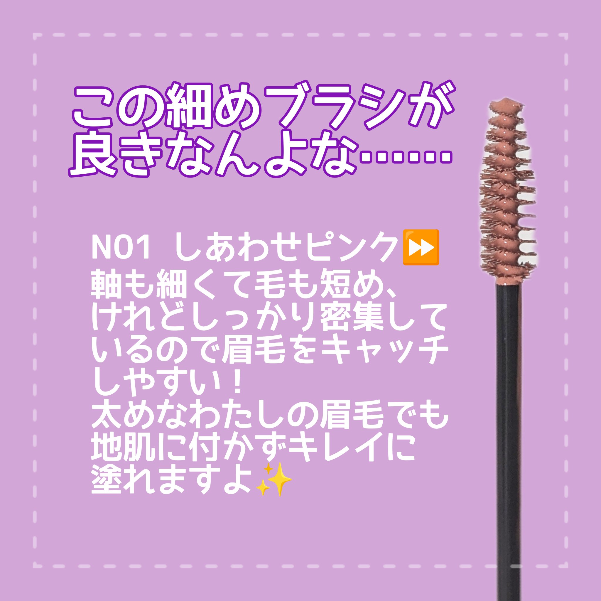 - ミニブラシでとにかく塗りやすい!! ふんわり仕上がる眉マスカラ 小回りの利くミニブラシがとっても塗りやすい眉マスカラ。 毛を1本1本逃さず、ナチュラルに染まります。 パリパリ感もなく、ふんわりとした自眉感のある仕上がりに! 地肌につきにくいのもうれしいポイント♡
