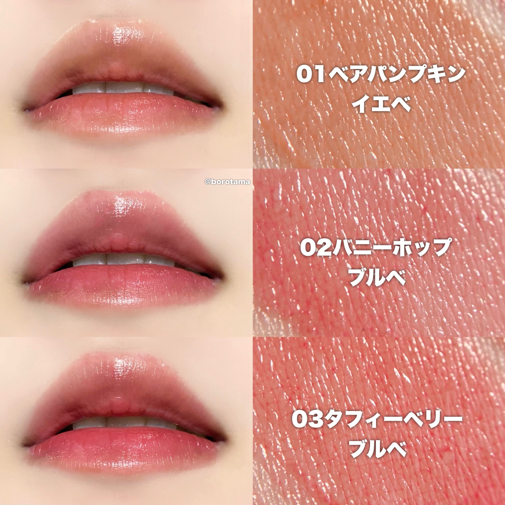 - <01 ベアパンプキン(BARE PUMPKIN)> オクチルドデカノール、ペンタイソステアリン酸ジペンタエリスリチル、ジ安息香酸PG、ヘキサ脂肪酸(C5-9)ジペンタエリスリチルエステルズ、トリ(カプリル酸/カプリン酸)グリセリル、合成ワックス、水添ポリイソブテン、ダイマージリノール酸(フィトステリル/イソステアリル/セチル/ステアリル/ベヘニル)、パラフィン、グリセリン、キャンデリラロウ、フェニルプロピルジメチルシロキシケイ酸、合成フルオロフロゴパイト、水添野菜油、リンゴ酸ジイソステアリル、酸化チタン、イソステアリン酸ソルビタン、ラウリルPEG-9ポリジメチルシロキシエチルジメチコン、アルガニアスピノサ核油、トリ酢酸テトラステアリン酸スクロース、ビニルジメチコン、(セバシン酸/イソパルミチン酸)ジグリセリル、ポリヒドロキシステアリン酸、ジステアルジモニウムヘクトライト、(エチレン/プロピレン)コポリマー、トリイソステアリン酸ポリグリセリル-2、レシチン、マイクロクリスタリンワックス、ポリエチレン、水、パルミチン酸エチルヘキシル、ミリスチン酸イソプロピル、イソステアリン酸、酸化鉄、ステアリン酸ポリグリセリル-10、炭酸プロピレン、ポリリシノレイン酸ポリグリセリル-3、黄5、黄4、1,2-ヘキサンジオール、赤202、ジイソステアリン酸ポリグリセリル-2、赤104(1)、青1、トコフェロール、ハス花エキス、ニンファエアアルバ花エキス、ヤマザクラ花エキス、ハイブリッドローズ花エキス、ソルビン酸K <02 バニーホップ(BUNNY HOP)> オクチルドデカノール、ペンタイソステアリン酸ジペンタエリスリチル、ジ安息香酸PG、ヘキサ脂肪酸(C5-9)ジペンタエリスリチルエステルズ、トリ(カプリル酸/カプリン酸)グリセリル、合成ワックス、水添ポリイソブテン、ダイマージリノール酸(フィトステリル/イソステアリル/セチル/ステアリル/ベヘニル)、パラフィン、グリセリン、リンゴ酸ジイソステアリル、キャンデリラロウ、フェニルプロピルジメチルシロキシケイ酸、合成フルオロフロゴパイト、酸化チタン、水添野菜油、イソステアリン酸ソルビタン、ラウリルPEG-9ポリジメチルシロキシエチルジメチコン、アルガニアスピノサ核油、トリ酢酸テトラステアリン酸スクロース、ビニルジメチコン、(セバシン酸/イソパルミチン酸)ジグリセリル、ポリヒドロキシステアリン酸、ジステアルジモニウムヘクトライト、(エチレン/プロピレン)コポリマー、トリイソステアリン酸ポリグリセリル-2、マイクロクリスタリンワックス、レシチン、ポリエチレン、水、パルミチン酸エチルヘキシル、ミリスチン酸イソプロピル、イソステアリン酸、ステアリン酸ポリグリセリル-10、酸化鉄、炭酸プロピレン、黄4、ポリリシノレイン酸ポリグリセリル-3、赤227、1,2-ヘキサンジオール、赤202、黄5、ジイソステアリン酸ポリグリセリル-2、青1、トコフェロール、ハス花エキス、ニンファエアアルバ花エキス、ヤマザクラ花エキス、ハイブリッドローズ花エキス、ソルビン酸K <03 タフィーベリー(TAFFY BERRY)> オクチルドデカノール、ペンタイソステアリン酸ジペンタエリスリチル、ジ安息香酸PG、ヘキサ脂肪酸(C5-9)ジペンタエリスリチルエステルズ、トリ(カプリル酸/カプリン酸)グリセリル、合成ワックス、水添ポリイソブテン、ダイマージリノール酸(フィトステリル/イソステアリル/セチル/ステアリル/ベヘニル)、パラフィン、グリセリン、キャンデリラロウ、フェニルプロピルジメチルシロキシケイ酸、合成フルオロフロゴパイト、水添野菜油、リンゴ酸ジイソステアリル、酸化チタン、イソステアリン酸ソルビタン、ラウリルPEG-9ポリジメチルシロキシエチルジメチコン、アルガニアスピノサ核油、トリ酢酸テトラステアリン酸スクロース、ビニルジメチコン、(セバシン酸/イソパルミチン酸)ジグリセリル、トリイソステアリン酸ポリグリセリル-2、ポリヒドロキシステアリン酸、ジステアルジモニウムヘクトライト、(エチレン/プロピレン)コポリマー、黄4、マイクロクリスタリンワックス、レシチン、ポリエチレン、水、パルミチン酸エチルヘキシル、ミリスチン酸イソプロピル、イソステアリン酸、ステアリン酸ポリグリセリル-10、酸化鉄、炭酸プロピレン、赤202、赤227、ポリリシノレイン酸ポリグリセリル-3、ジイソステアリン酸ポリグリセリル-2、1,2-ヘキサンジオール、黄5、トコフェロール、ハス花エキス、ニンファエアアルバ花エキス、ヤマザクラ花エキス、ハイブリッドローズ花エキス、ソルビン酸K <04 キャメルナッツ(CAMEL NUTS)> オクチルドデカノール、ペンタイソステアリン酸ジペンタエリスリチル、ジ安息香酸PG、ヘキサ脂肪酸(C5-9)ジペンタエリスリチルエステルズ、トリ(カプリル酸/カプリン酸)グリセリル、合成ワックス、水添ポリイソブテン、ダイマージリノール酸(フィトステリル/イソステアリル/セチル/ステアリル/ベヘニル)、パラフィン、グリセリン、リンゴ酸ジイソステアリル、キャンデリラロウ