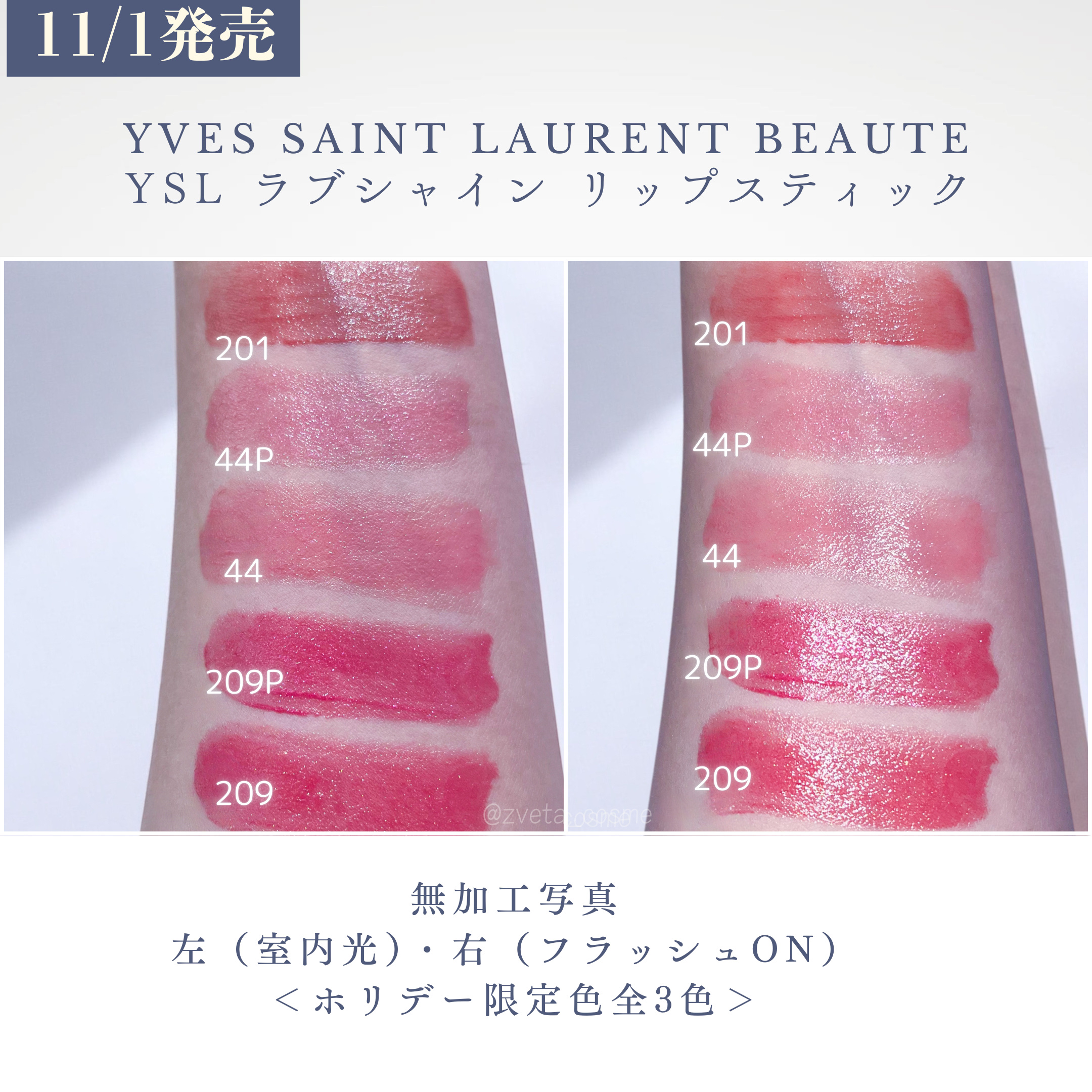 YSL GOLD WINTER BLOSSOMが…やばい…💛🤍 大人気リップ ラブシャインの限定新色が出るよ〜♡ 既存色のNo.209とNo.44にピンクパールを配合したホリデーらしい煌めきの限定色は1本で使っても普段のリップに重ねても本当に可愛い…♡ ノエルの限定パケはギフトにもぴったり🤍 YSLのノエルコレクションのテーマはYSL GOLD WINTER BLOSSOM💛
