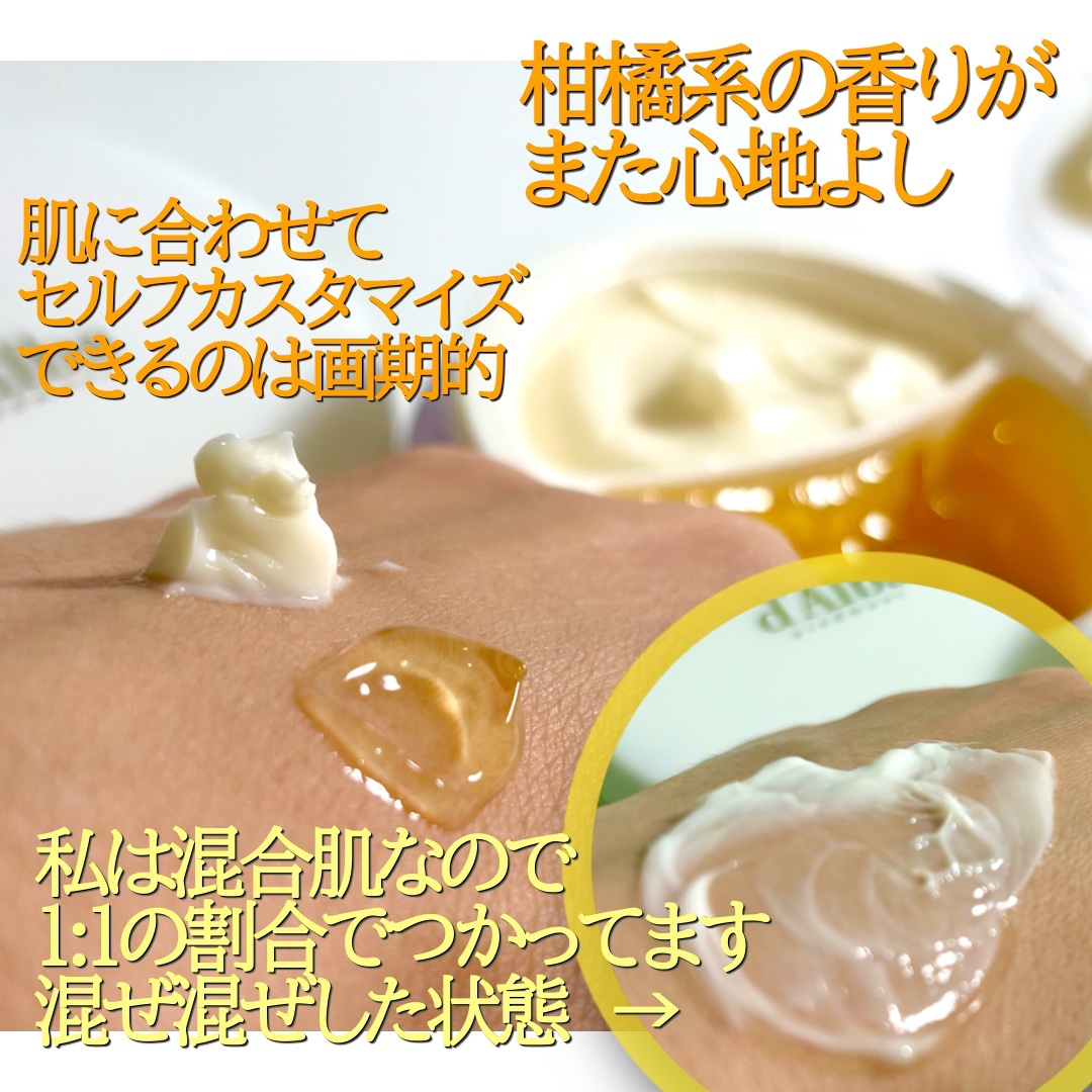 アクアセラムは、透明感のあるオレンジ色でプルプルしたテクスチャー、さっぱりとした使用感。ヒアルロン酸、パンテノール、ツボクサエキス*が含まれていて肌に水分を与え肌のキメを整えてくれます🧡 インテンスクリームは白色のややかためのテクスチャー、もっちりした使用感。イタリア産ホワイトトリュフ*が含まれていて、肌にうるおいを与えツヤのあるもち肌へ導いてくれます🤍 自分の肌に合わせてカスタマイズできるのは画期的〜。柑橘系の香りがまた心地よいので肌につかっていて癒されます。