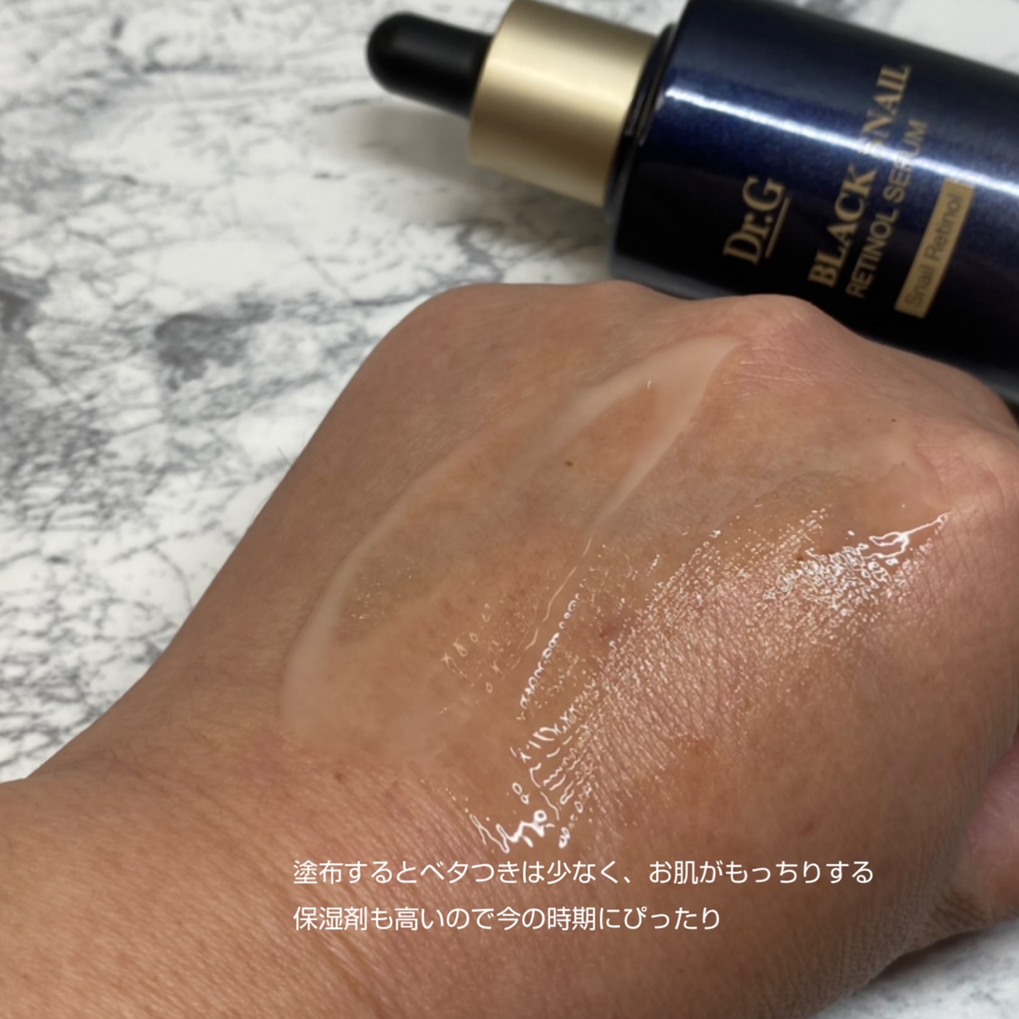 ブラックスネイルと低刺激のレチノールを配合した美容液!私がDr.Gの中で一番といってよいくらい好きなのがこのブラックスネイルラインなんだよね! 第三世代レチノールと、ブラックスネイルを配合した、Dr.G独自のブラックスネイルレチノールを開発し使っているのがコチラなのです! セラムはベージュっぽい色で、乳液くらいのとろりんテクスチャー。のびは良くてべたつかないのにしっとり感のある仕上がり!