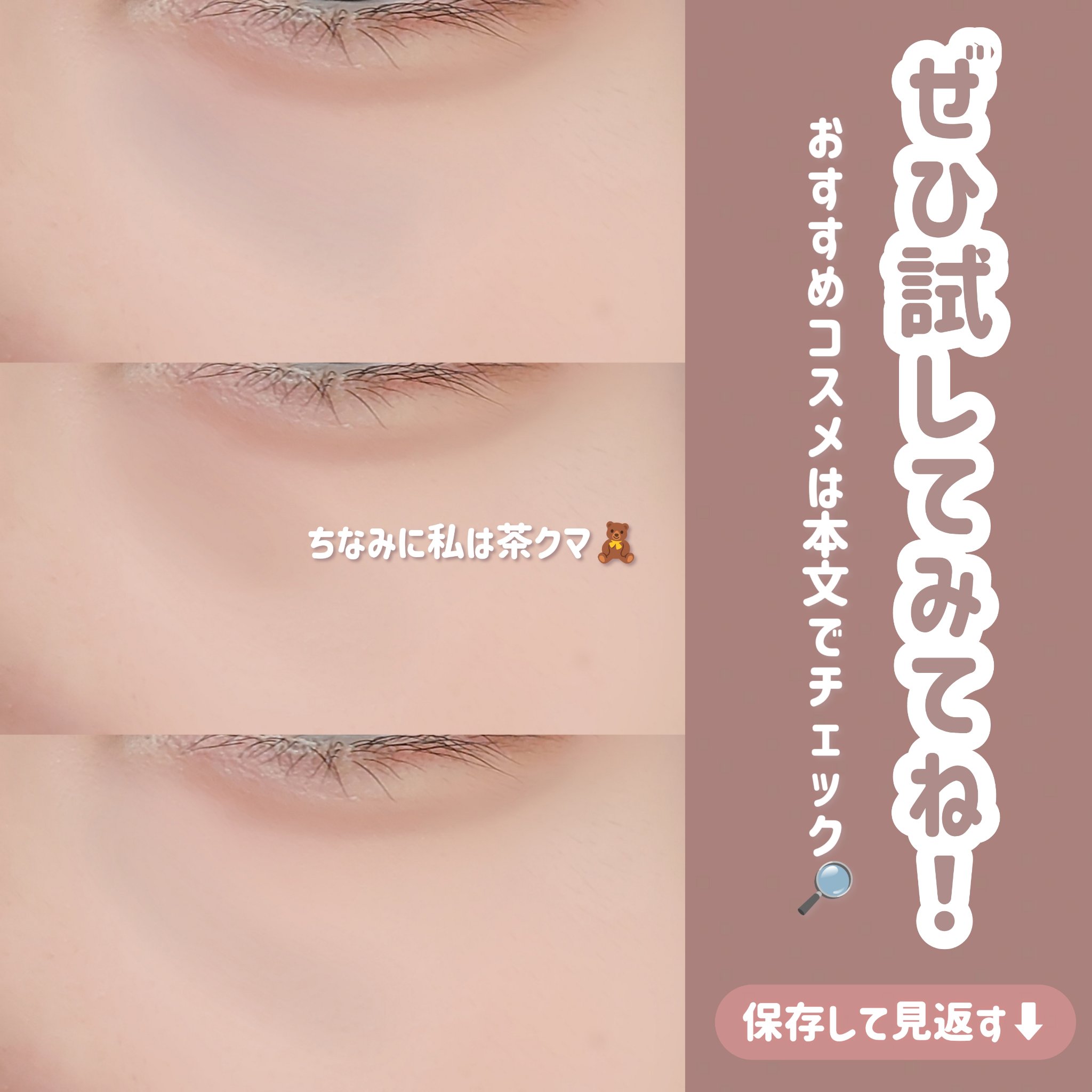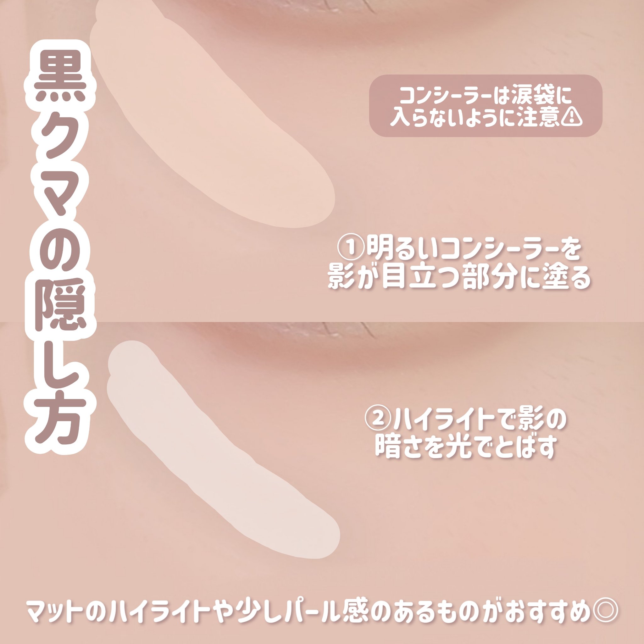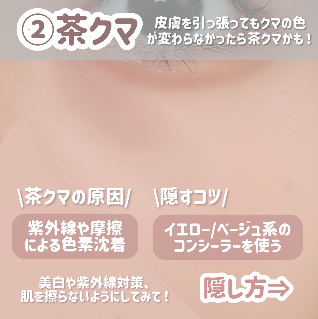 可愛くメイクしてもクマがあると顔色が悪く疲れて見えて台無しに、、、 クマは大きく分けて3タイプ/青クマ/茶クマ/黒クマ の3種類がある♪ それぞれ補色を駆使して目立たなくするのがクマ隠しの大事なポイント✍️ 睡眠不足や疲れなどによる血行不良が原因💦 紫外線や摩擦などによる色素沈着が原因💦 目の下の脂肪の膨らみやたるみが原因💦 実は1番隠すのが難しいのが黒クマ🧸 間違った方法でカバーすると逆に目立ってしまうので自分のタイプを知った上で正しくカバーするのが大切✨